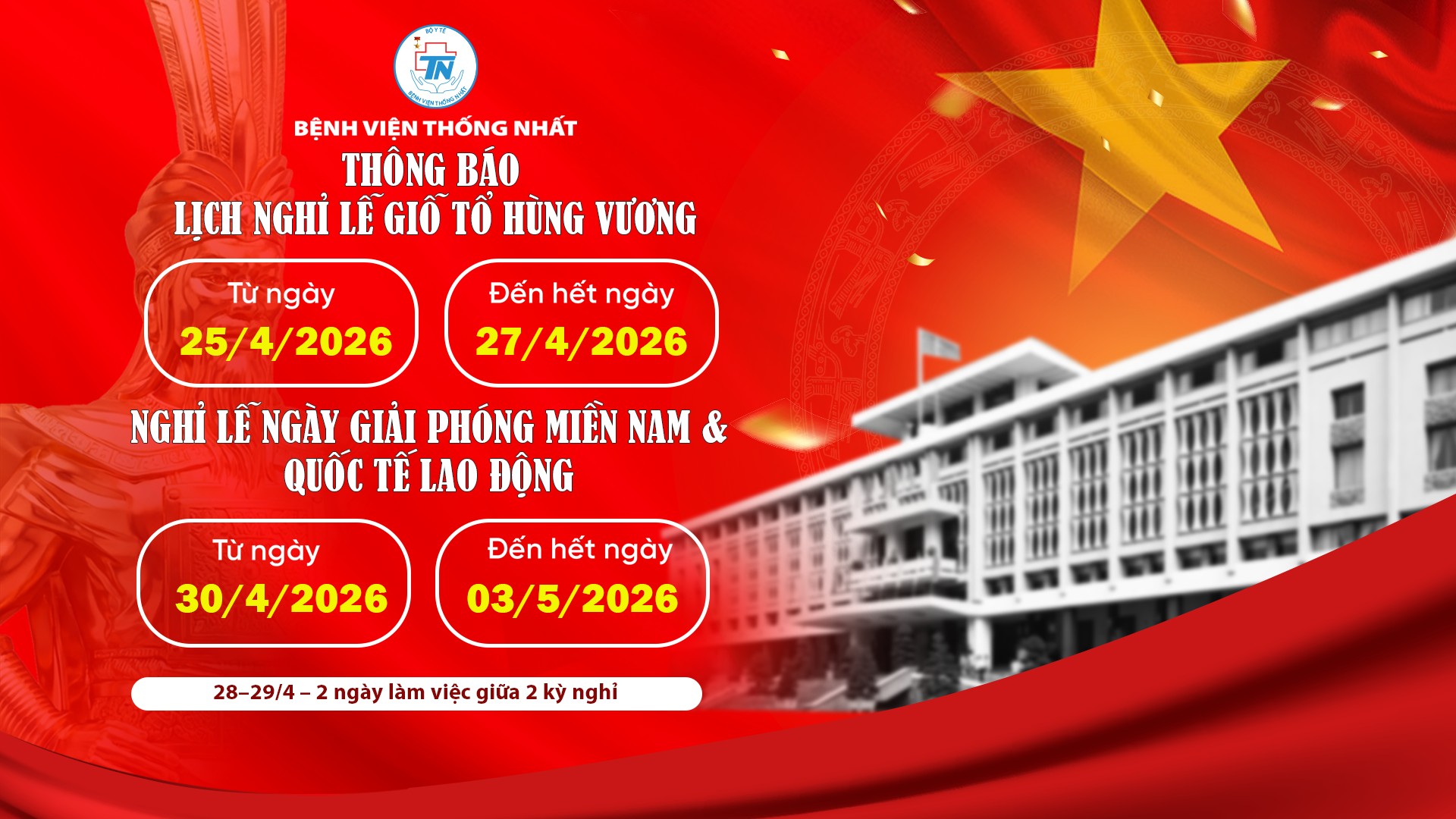 - Lịch nghỉ lễ Giỗ Tổ Hùng Vương: Bệnh viện tạm ngưng khám ngoại trú từ thứ Bảy (ngày 25/4/2026) đến hết thứ Hai (ngày 27/4/2026).