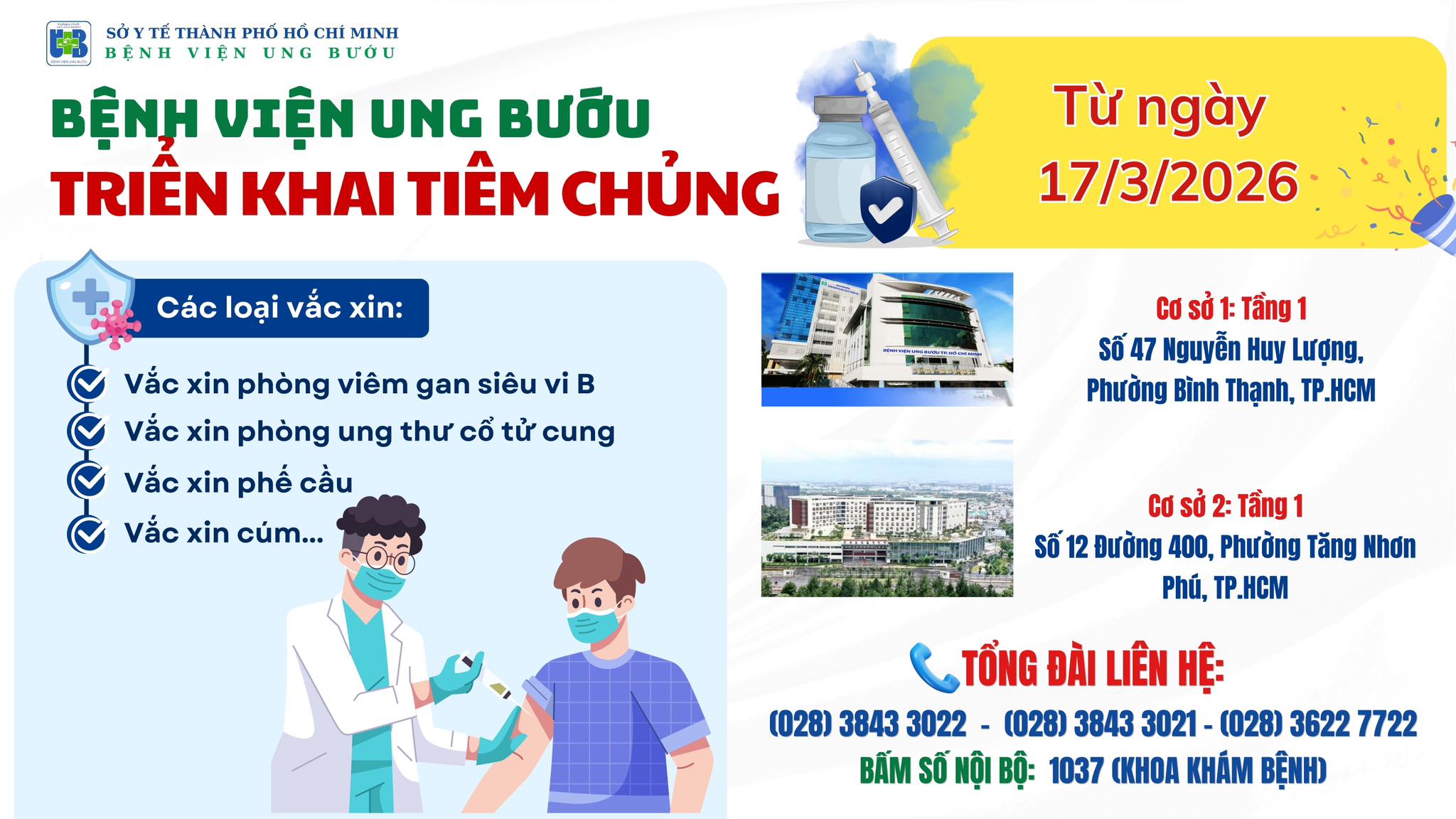 Từ ngày 17/3/2026, Bệnh viện Ung Bướu TPHCM chính thức triển khai dịch vụ tiêm chủng, cung cấp nhiều loại vắc xin phòng bệnh cho người dân.