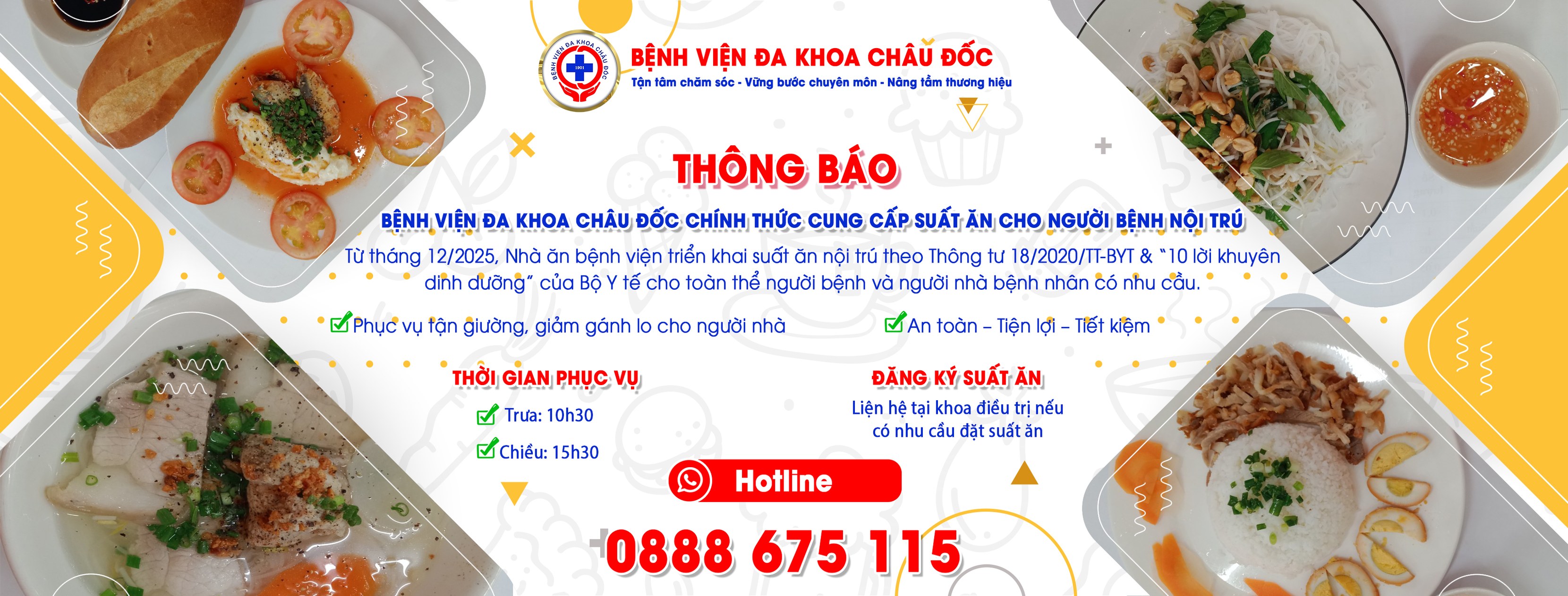 Với trường hợp của gia đình bạn, suất ăn nội trú là lựa chọn có thể cân nhắc. Theo thông báo từ Bệnh viện Đa khoa Châu Đốc, từ tháng 12/2025, bệnh viện đã chính thức triển khai cung cấp suất ăn cho người bệnh nội trú, tuân thủ Thông tư 18/2020/TT-BYT và 10 lời khuyên dinh dưỡng của Bộ Y tế.