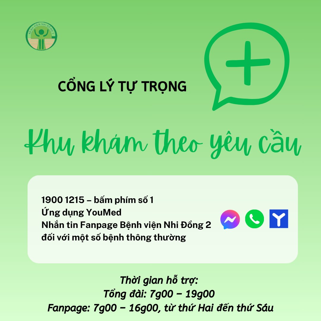 - Nhắn tin Fanpage: Fanpage Bệnh viện Nhi Đồng 2 (chỉ áp dụng đối với một số bệnh thông thường)