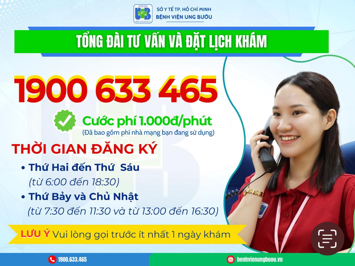 Hiện tại, tổng đài chăm sóc khách hàng của Bệnh viện Ung Bướu TPHCM là 1900 633 465 (1.000đ/phút, đã bao gồm phí nhà mạng).