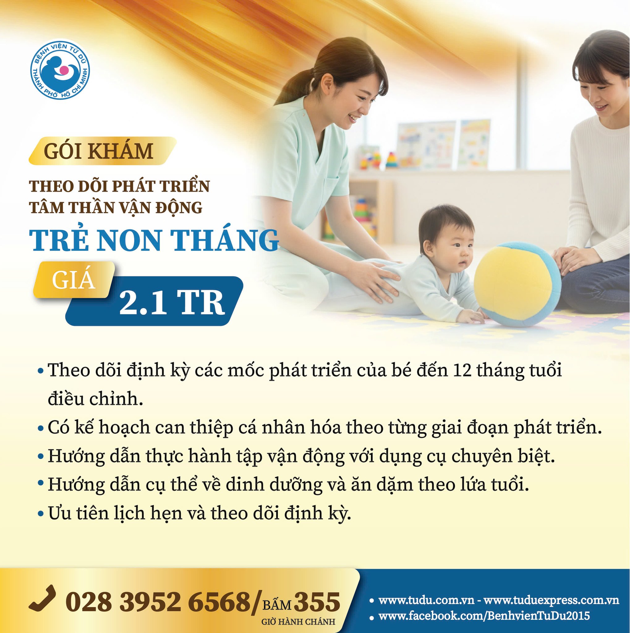 Bệnh viện Từ Dũ đang triển khai Gói khám theo dõi phát triển tâm thần - vận động cho trẻ non tháng với chi phí trọn gói là 2.100.000 đồng.