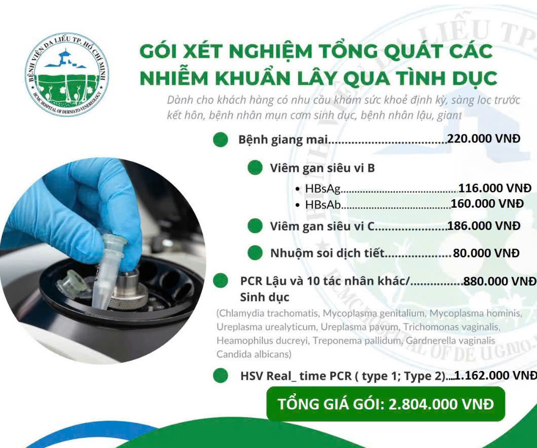 Bệnh viện Da liễu TP.HCM hiện là cơ sở đầu ngành tại miền Nam trong việc chẩn đoán và điều trị các bệnh lây truyền qua đường tình dục. Dựa trên thông tin niêm yết mới nhất, chi phí gói "Xét nghiệm tổng quát các nhiễm khuẩn lây qua tình dục" được cụ thể hóa từng hạng mục như sau: