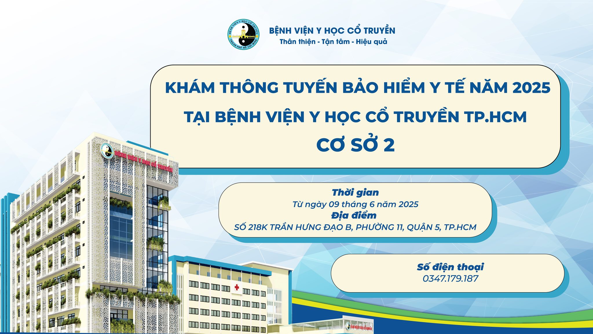 Từ ngày 9/6/2025, Cơ sở 2 - Bệnh viện Y học Cổ truyền TPHCM chính thức triển khai khám chữa bệnh BHYT thông tuyến, áp dụng cho tất cả người dân có thẻ BHYT, không phân biệt nơi đăng ký ban đầu.