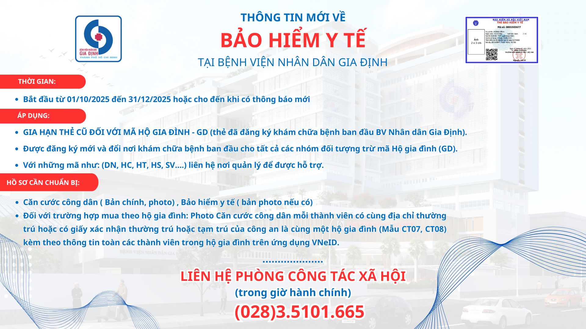 Theo thông tin chính thức từ Bệnh viện Nhân Dân Gia Định, trong quý IV/2025 (từ tháng 10 đến hết tháng 12), bệnh viện chỉ tiếp nhận gia hạn thẻ BHYT đối với các trường hợp đã đăng ký nơi khám chữa bệnh ban đầu tại Bệnh viện Nhân Dân Gia Định trước đó.