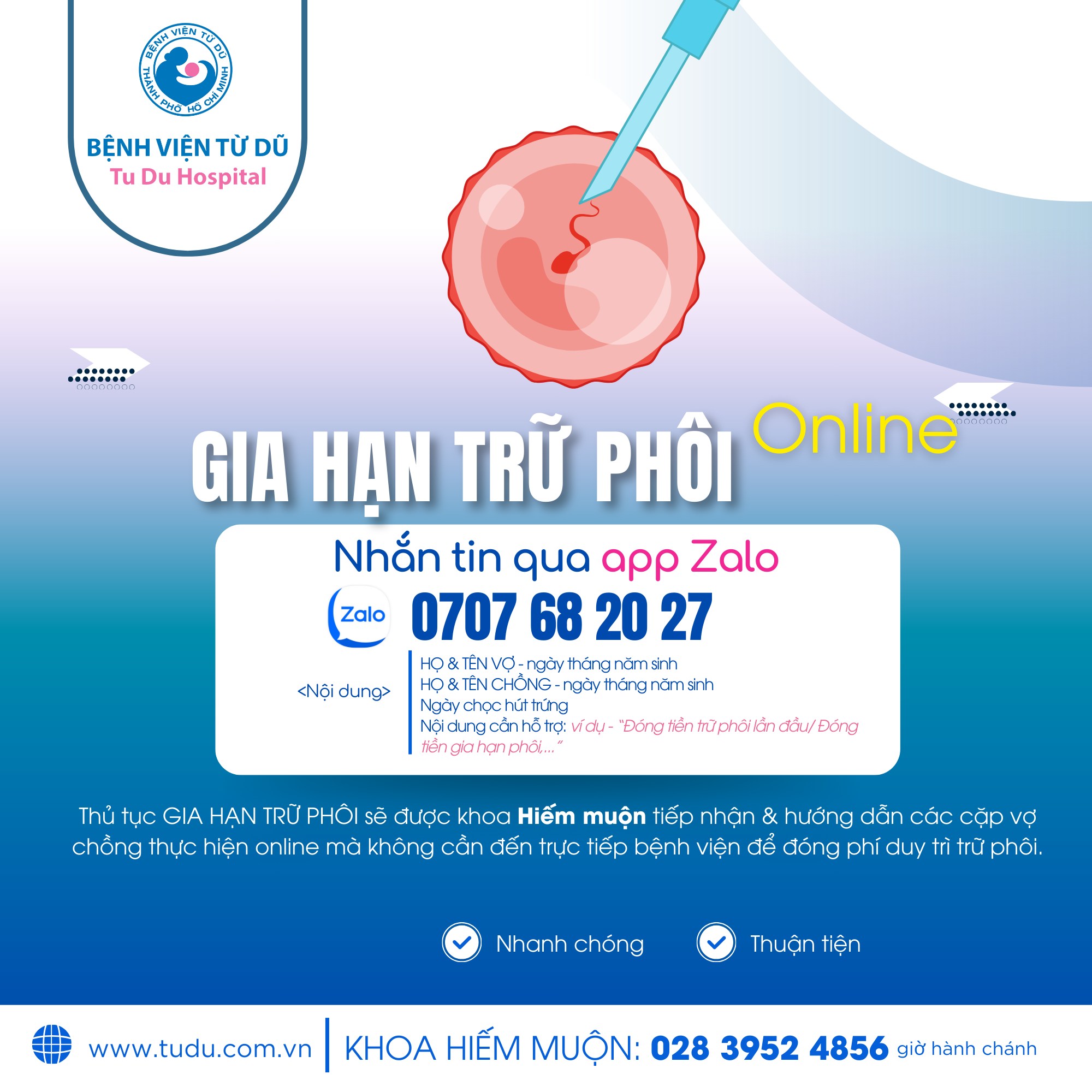 Hiện nay Bệnh viện Từ Dũ đã triển khai dịch vụ gia hạn trữ phôi online nhằm tạo thuận lợi cho các cặp vợ chồng. Bạn không cần đến trực tiếp bệnh viện mà chỉ cần nhắn tin qua Zalo số 0707 68 20 27 để được Khoa Hiếm muộn tiếp nhận và hướng dẫn chi tiết.