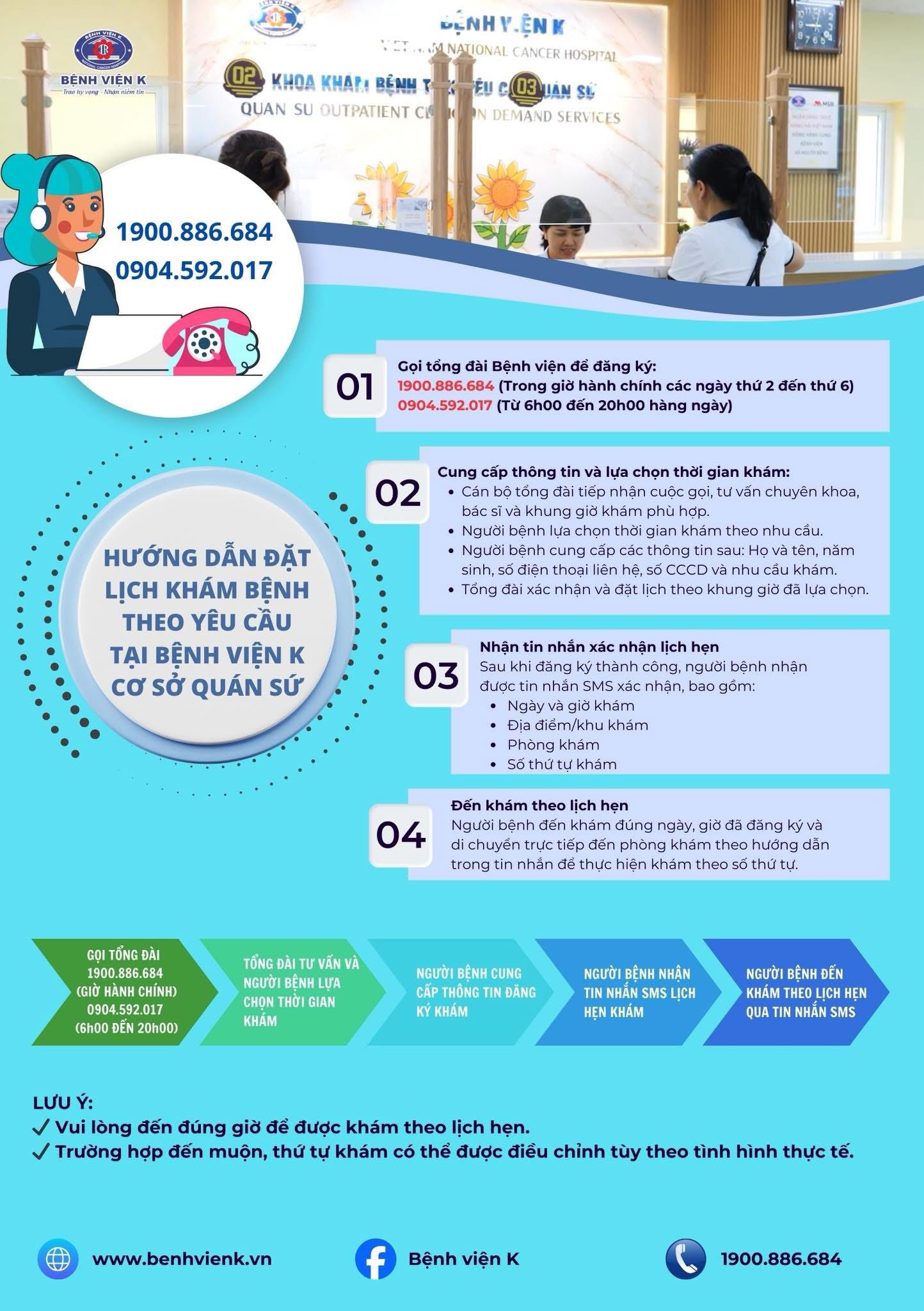 Hiện nay tại Bệnh viện K – cơ sở Quán Sứ, người bệnh có thể đăng ký khám theo yêu cầu và nhận ngay lịch hẹn cụ thể với bác sĩ thông qua tổng đài của bệnh viện. Đây là một cải tiến mới nhằm giúp người bệnh chủ động thời gian và giảm bớt thủ tục khi đến khám.
