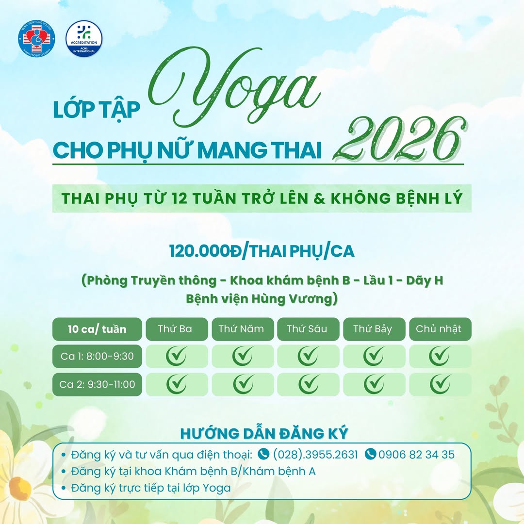 Lớp Yoga dành cho phụ nữ mang thai năm 2026 do Bệnh viện Hùng Vương tổ chức là chương trình phù hợp cho các thai phụ muốn rèn luyện thể chất và chuẩn bị tốt cho quá trình sinh nở.