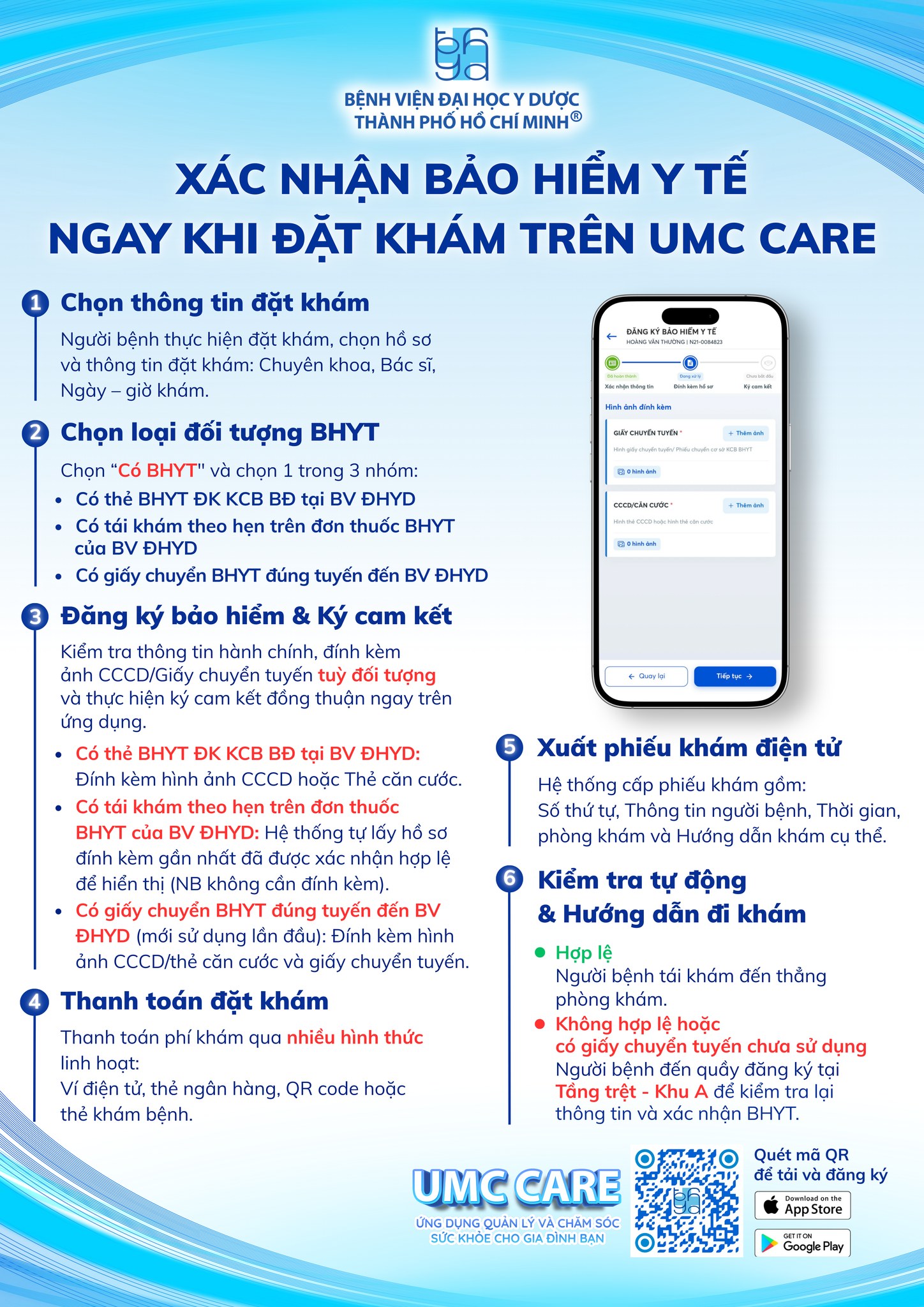 Tôi thấy trên ứng dụng UMC Care của Bệnh viện Đại học Y Dược TPHCM có bước xác nhận thông tin BHYT ngay khi đặt khám, nên muốn hỏi: nếu tôi đã đăng ký và xác nhận BHYT thành công trên app, khi đến bệnh viện thì có cần phải ra quầy để xác nhận lại nữa không, hay có thể đi thẳng vào phòng khám?