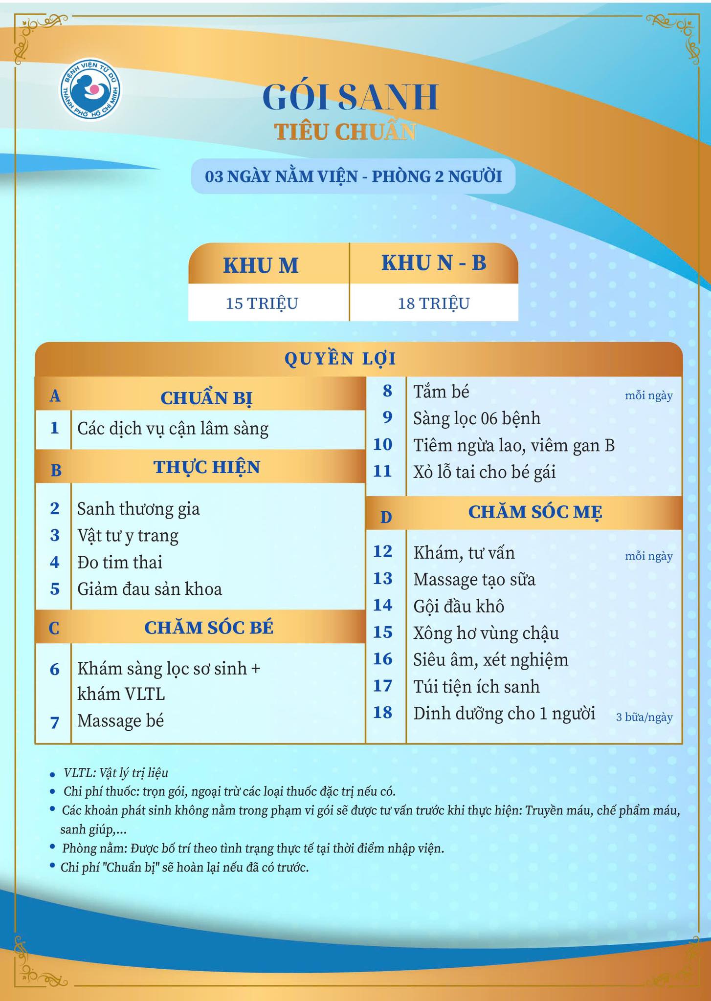Gói sanh tiêu chuẩn tại Bệnh viện Từ Dũ là dịch vụ sinh con trọn gói giúp sản phụ được chăm sóc toàn diện từ lúc nhập viện đến khi xuất viện. Gói áp dụng cho 3 ngày nằm viện, phòng 2 người, với giá trọn gói: 15 triệu cho khu M và 18 triệu cho khu N - B.