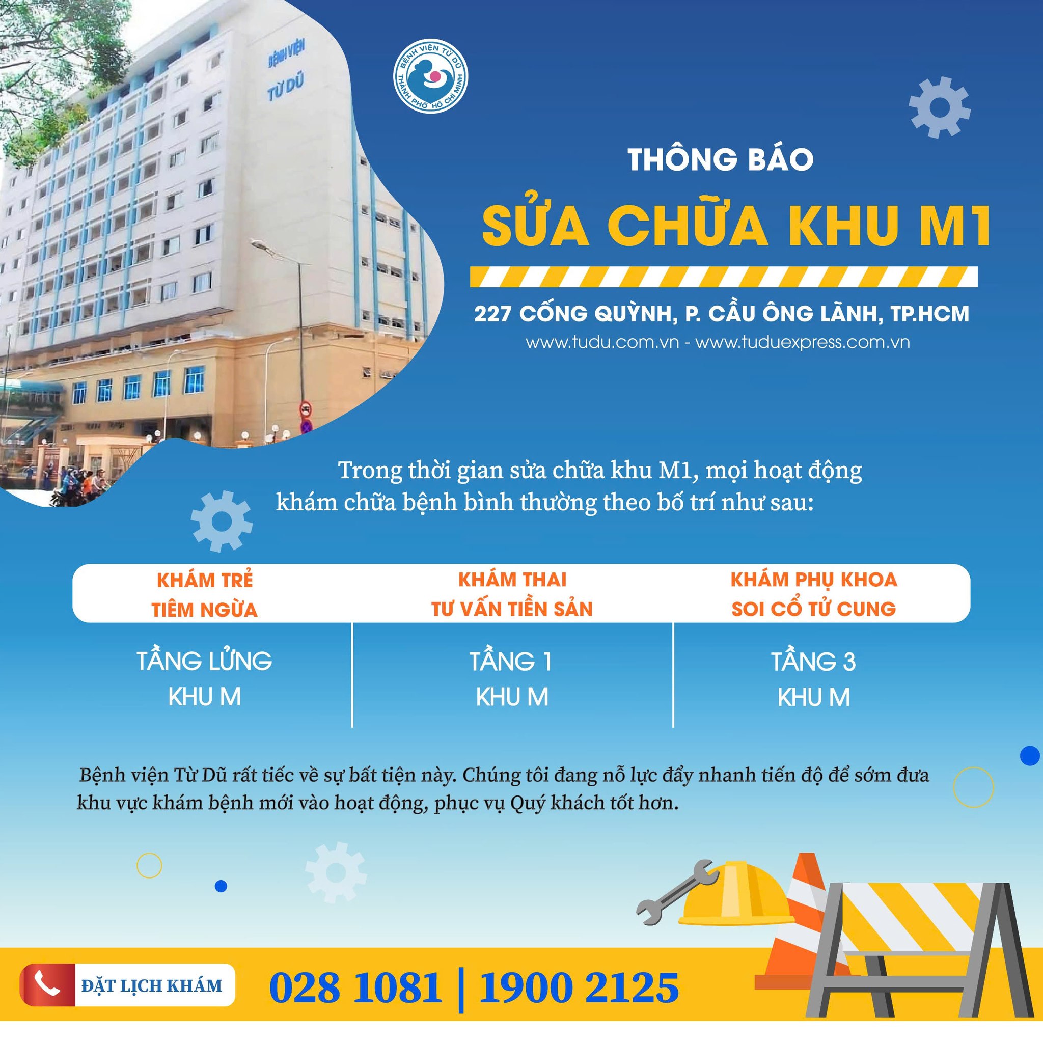 Để nâng cao cơ sở vật chất và không gian thăm khám, Bệnh viện Từ Dũ hiện đang triển khai sửa chữa, nâng cấp khu M1. Tuy nhiên, bạn hoàn toàn yên tâm vì mọi hoạt động thăm khám vẫn diễn ra bình thường và đã được bệnh viện bố trí lại tại các tầng khác thuộc Khu M để đảm bảo sự thuận tiện nhất cho người bệnh.
