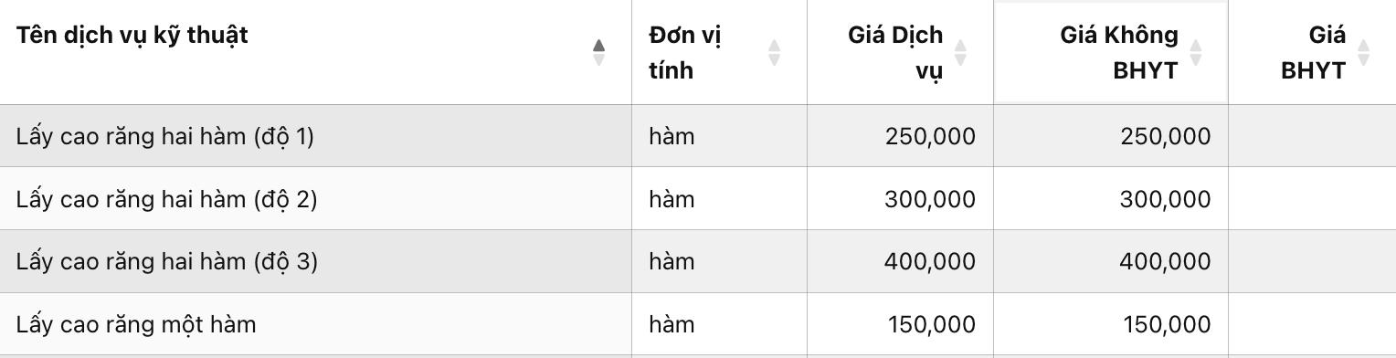Trung tâm Răng Hàm Mặt kỹ thuật cao - Bệnh viện Thống Nhất đang triển khai dịch vụ lấy cao răng với mức giá cụ thể tùy theo tình trạng răng của người bệnh như sau: