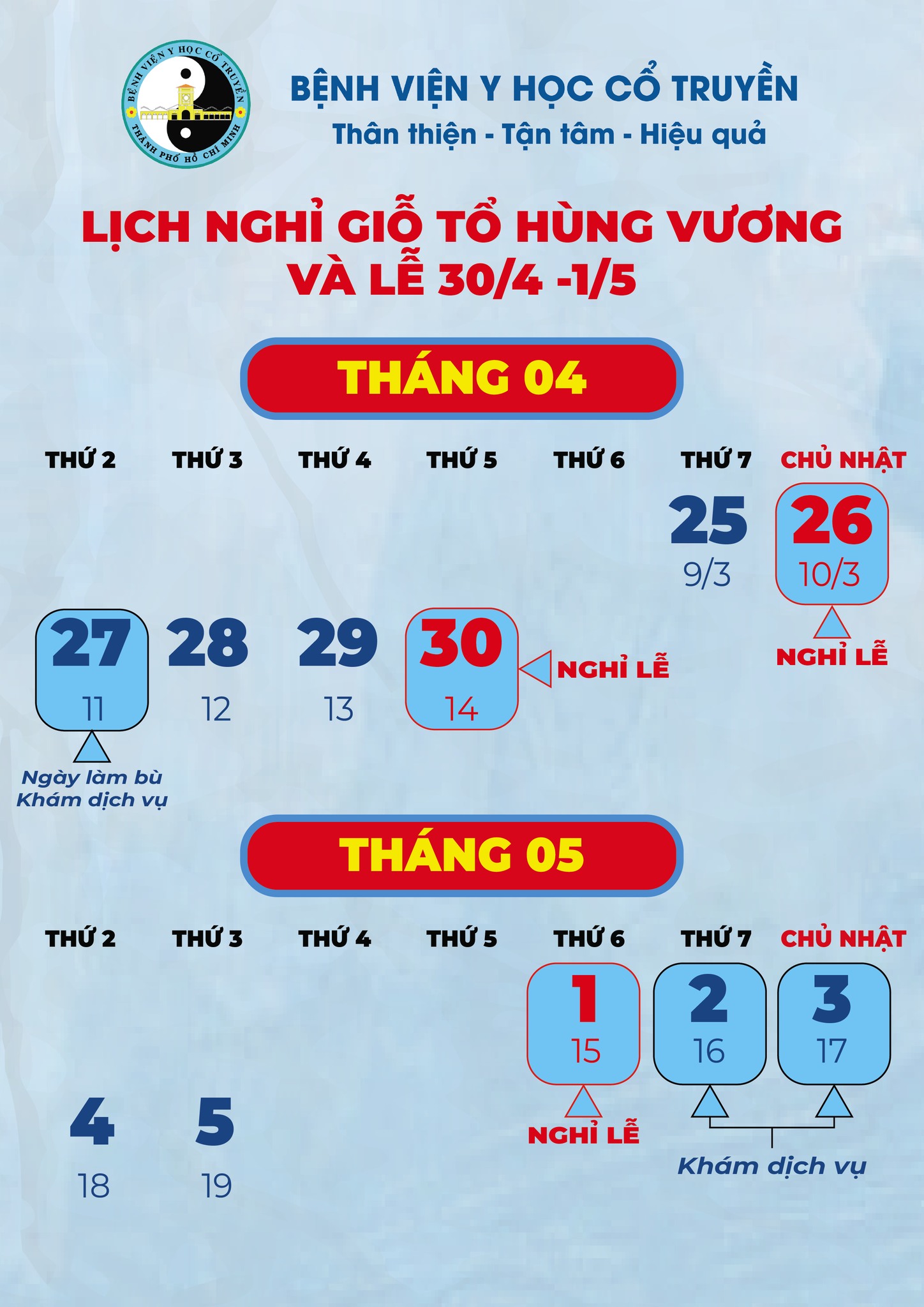 Lịch khám Bệnh viện Y học cổ truyền TP.HCM dịp Giỗ Tổ Hùng Vương, 30/4 và 1/5 thế nào?