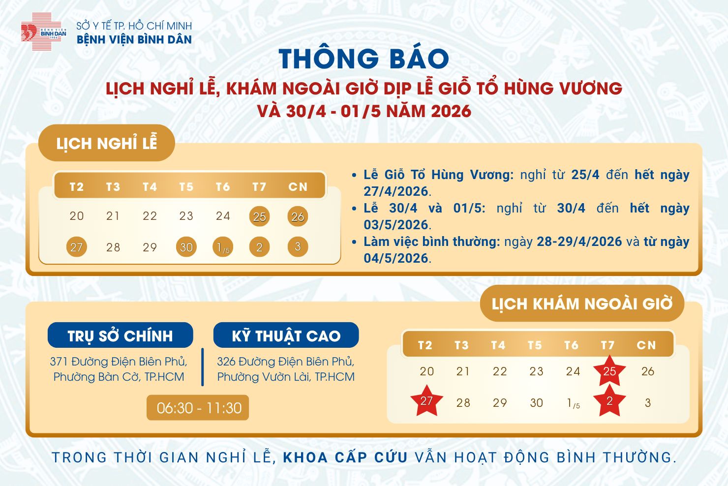 Trong dịp lễ Giỗ Tổ Hùng Vương và 30/4 - 1/5 năm 2026, Bệnh viện Bình Dân sẽ nghỉ lễ chính thức từ ngày 25/4 đến hết 27/4 và từ ngày 30/4 đến hết 03/5. Các ngày 28/4, 29/4 và từ ngày 04/5 bệnh viện sẽ làm việc lại bình thường.