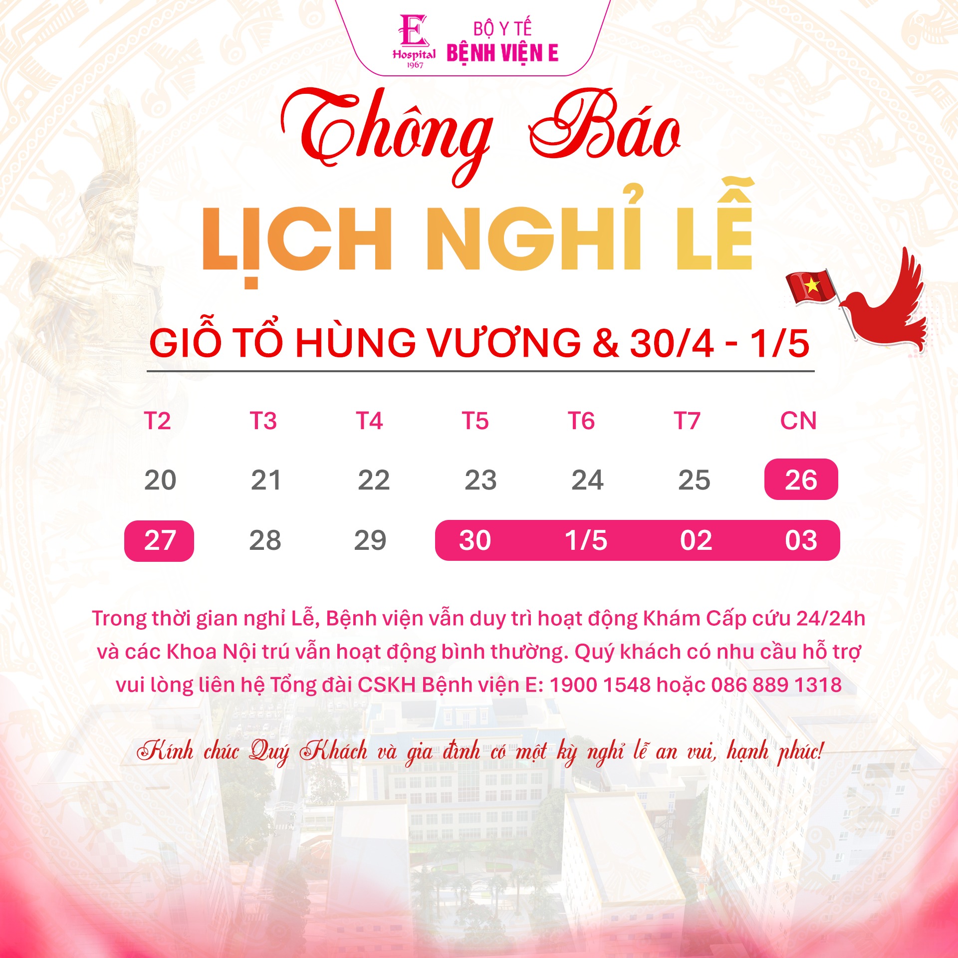 Về lịch hoạt động trong kỳ nghỉ lễ tháng 4 và tháng 5 sắp tới, Bệnh viện E đã có thông báo chính thức như sau: