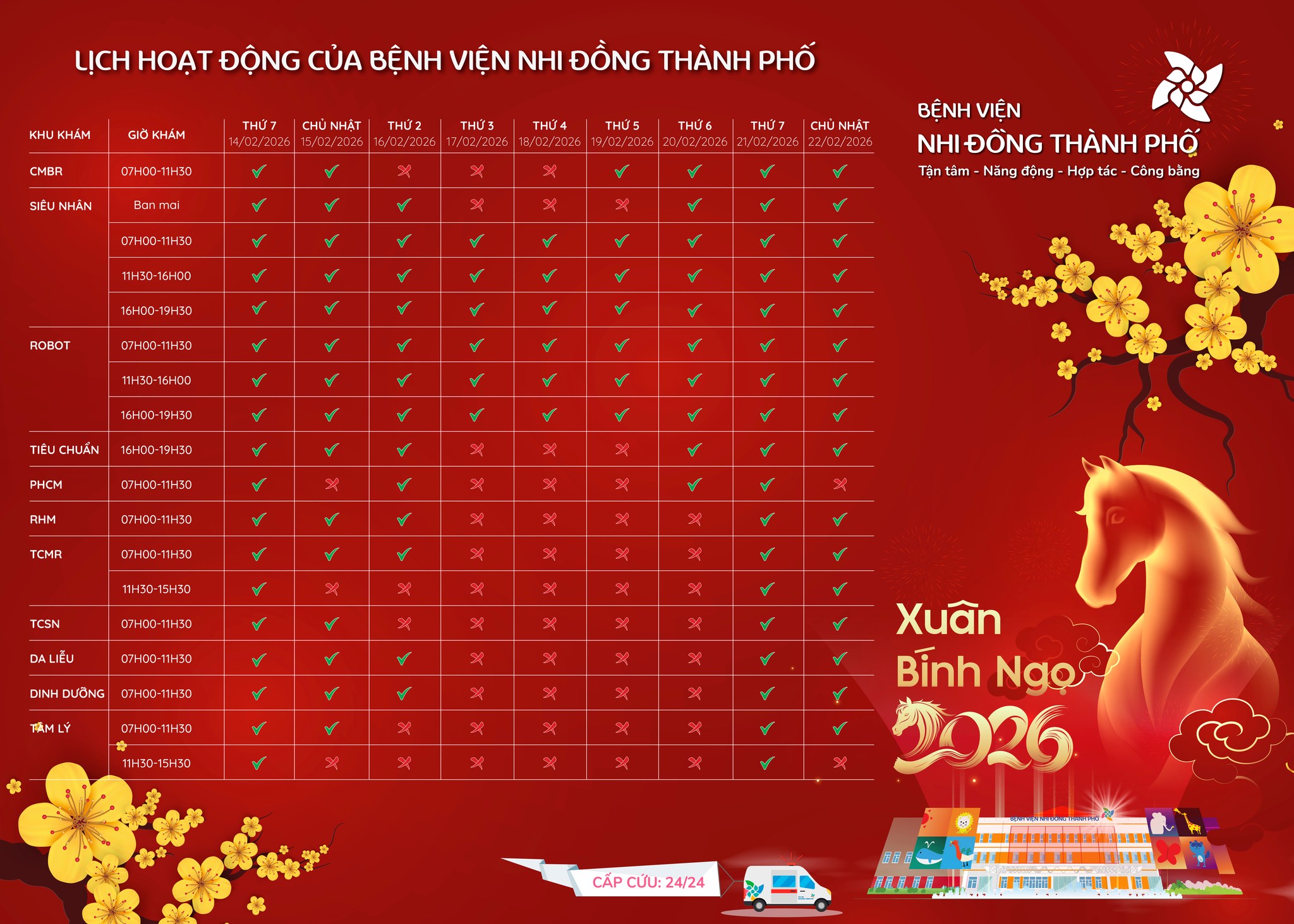 Bệnh viện Nhi đồng Thành phố nghỉ Tết Nguyên đán Bính Ngọ 2026 trong 09 ngày, từ 14/02/2026 (tức 27 tháng Chạp) đến hết ngày 22/02/2026 (tức mùng 6 Tết).
