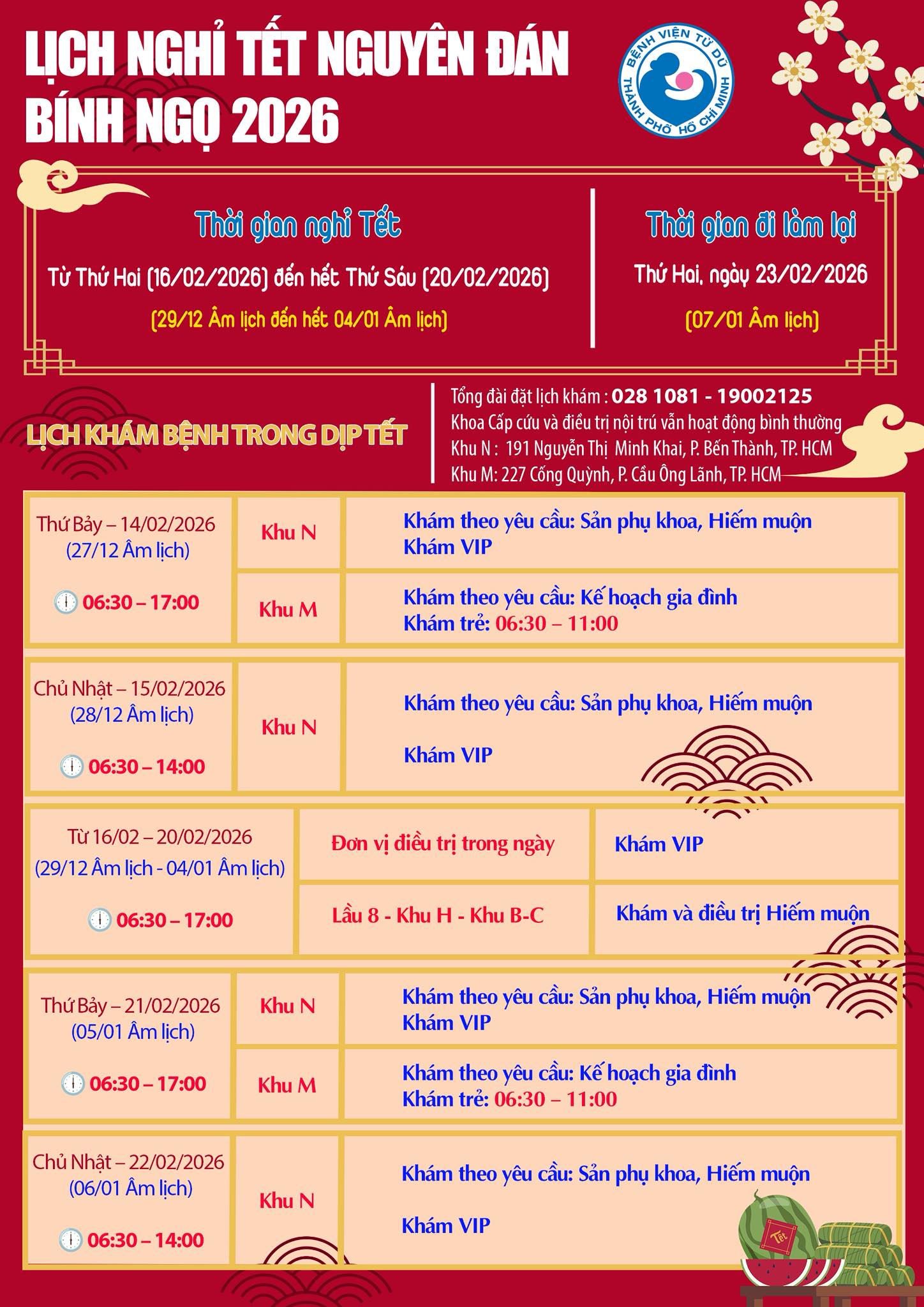 Bệnh viện Từ Dũ nghỉ Tết Nguyên đán Bính Ngọ 2026 từ 16/02/2026 (tức 29 tháng Chạp) đến hết ngày 20/02/2026 (tức mùng 4 Tết).