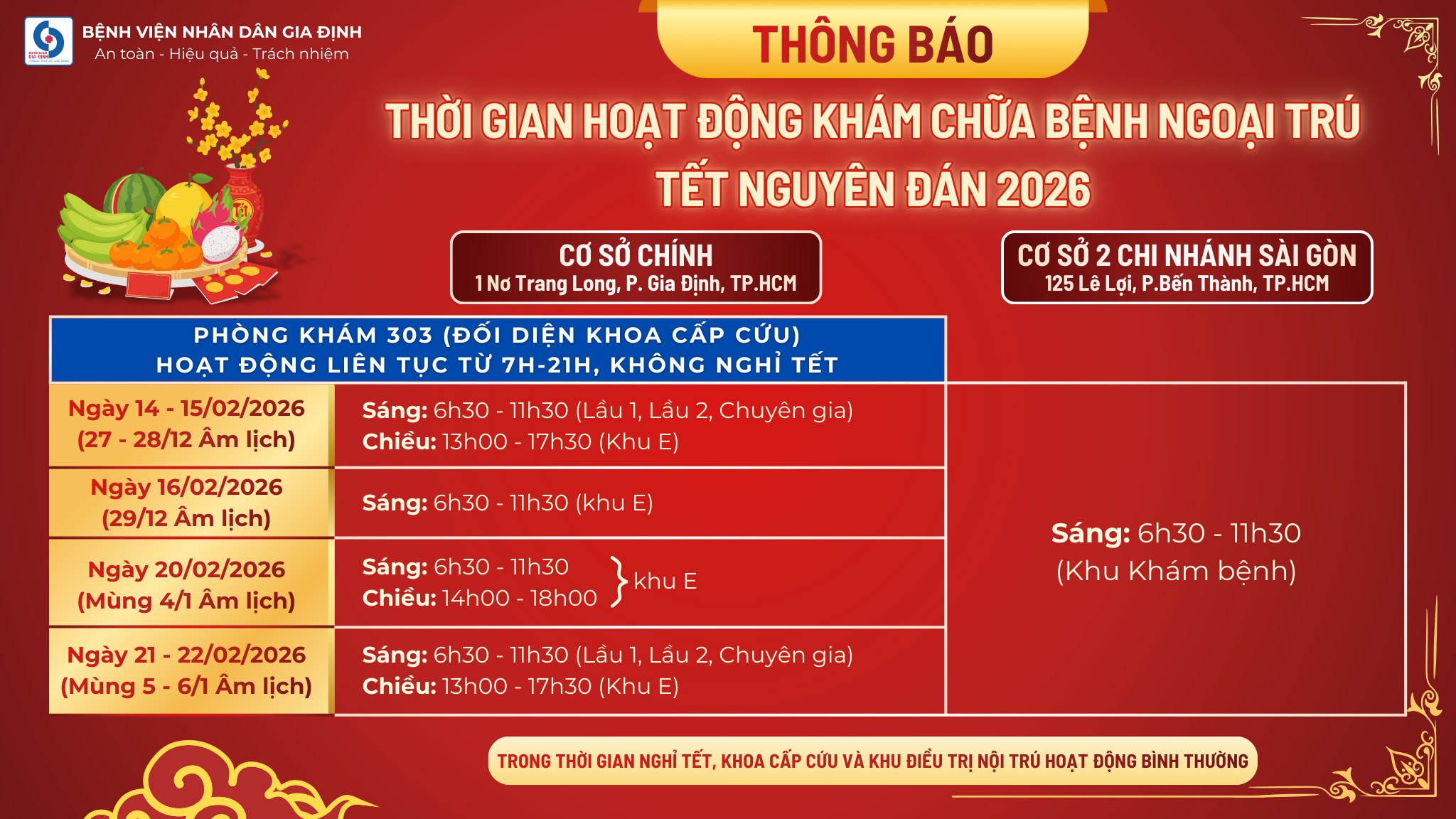 - Phòng khám 303 (đối diện Khoa Cấp cứu) hoạt động liên tục từ 7h - 21h không nghỉ Tết.