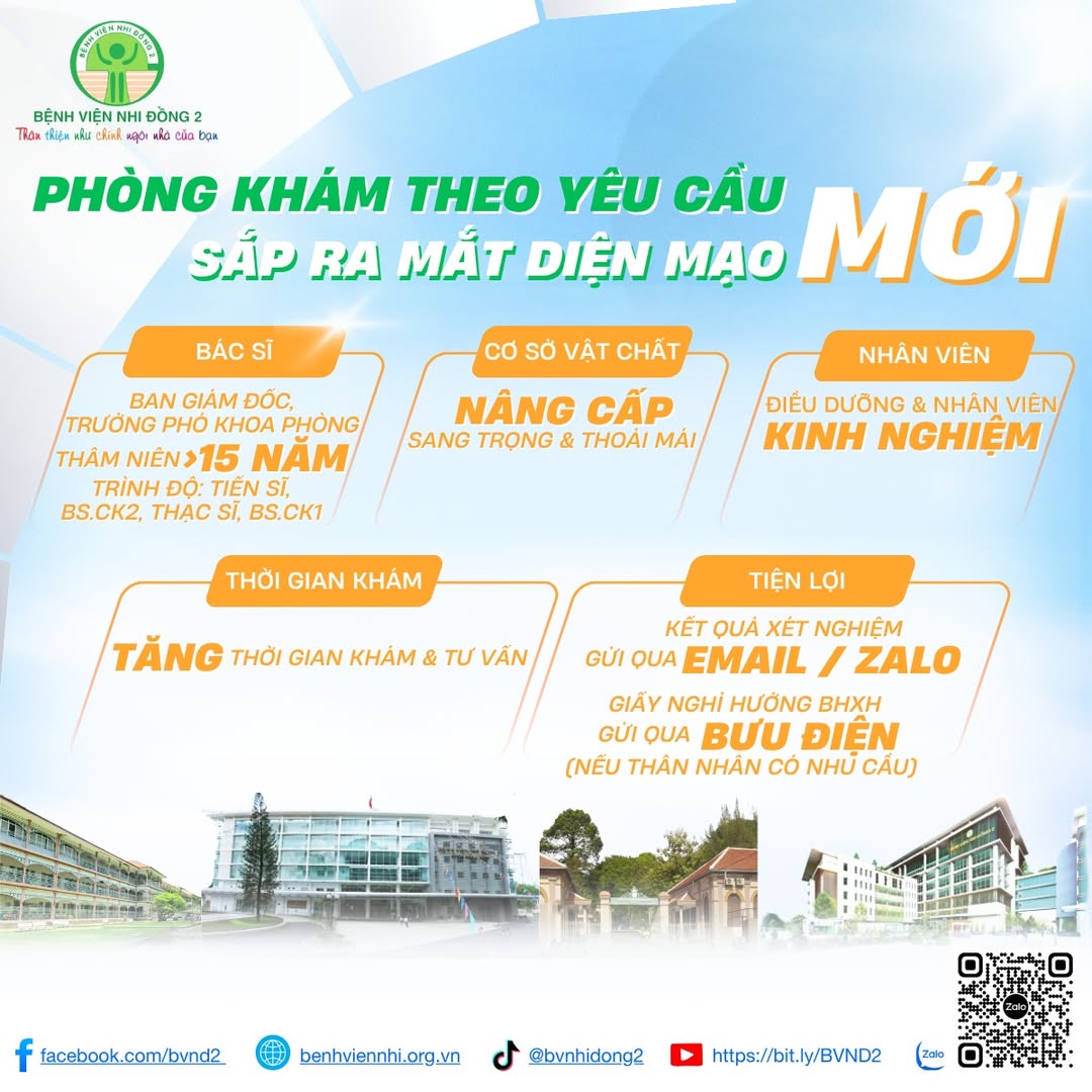 Phòng khám Theo yêu cầu của Bệnh viện Nhi Đồng 2 hiện đang trong quá trình nâng cấp và chuẩn bị ra mắt với diện mạo hoàn toàn mới tại cổng số 14 đường Lý Tự Trọng (TPHCM). Thời gian khai trương chính thức sẽ được bệnh viện công bố trong thời gian tới.