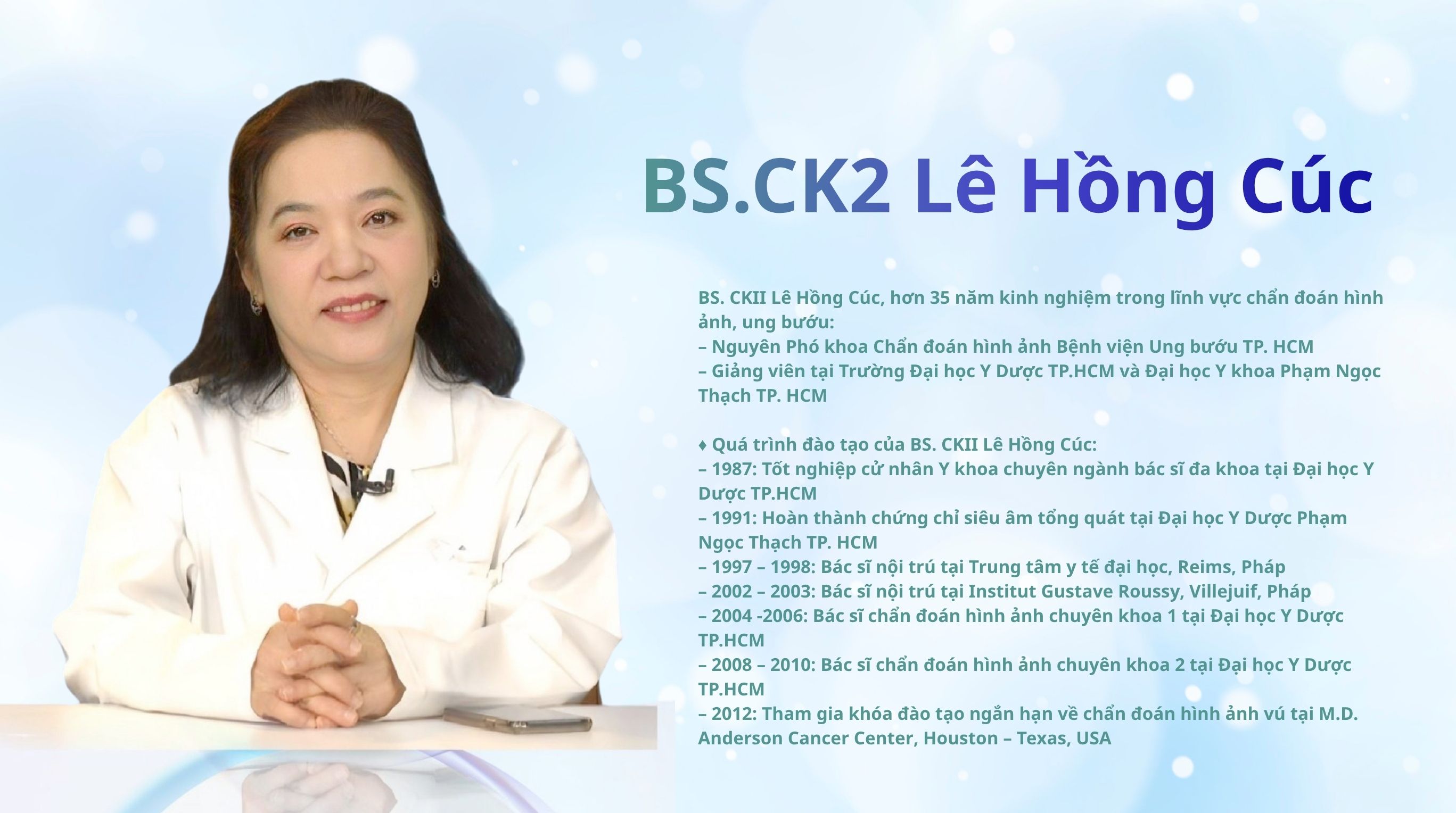 BS.CK2 Lê Hồng Cúc là bác sĩ có hơn 35 năm kinh nghiệm trong lĩnh vực chẩn đoán hình ảnh và ung bướu. Bác sĩ từng là Nguyên Phó khoa Chẩn đoán hình ảnh Bệnh viện Ung bướu TPHCM, đồng thời tham gia giảng dạy tại Đại học Y Dược TPHCM và Đại học Y khoa Phạm Ngọc Thạch. Bác sĩ cũng có quá trình đào tạo chuyên sâu trong và ngoài nước, từng tu nghiệp tại Pháp và tham gia các chương trình đào tạo về chẩn đoán hình ảnh ung thư tại Mỹ.