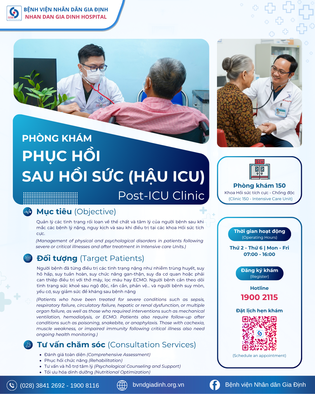 Ba tôi vừa xuất viện sau thời gian điều trị viêm phổi nặng phải nằm hồi sức tích cực (ICU). Tôi nghe nói Bệnh viện Nhân Dân Gia Định có Phòng khám phục hồi sau hồi sức (Hậu ICU), giúp theo dõi và chăm sóc người bệnh sau khi ra khỏi ICU. Xin hỏi phòng khám này ở đâu, giờ làm việc như thế nào và có cần đăng ký trước không ạ?