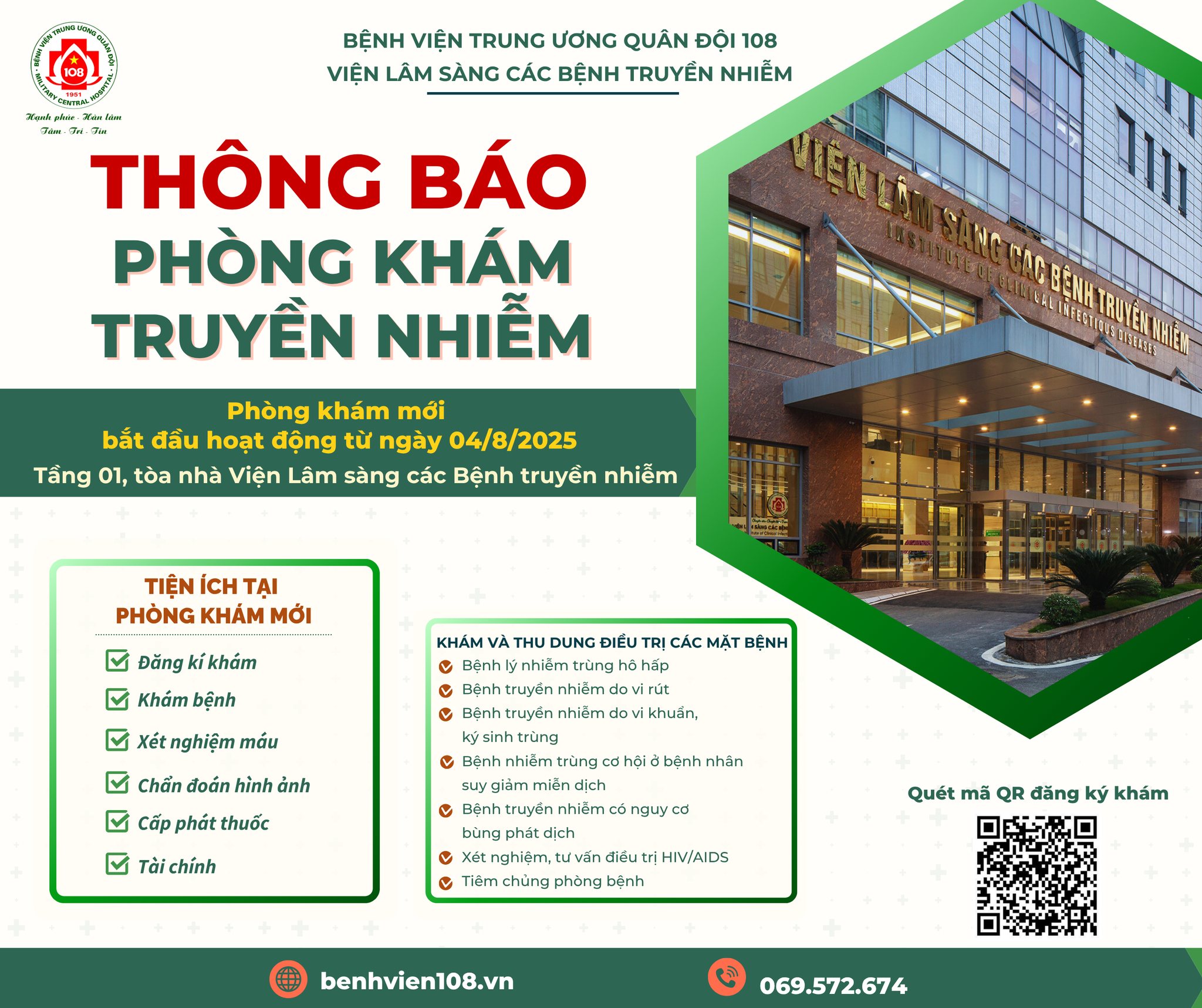 Theo thông báo từ Viện Lâm sàng các Bệnh truyền nhiễm - Bệnh viện TWQĐ 108, phòng khám Truyền nhiễm mới sẽ chính thức hoạt động từ ngày 04/8/2025, tại Tầng 01, tòa nhà Viện Lâm sàng các Bệnh truyền nhiễm.