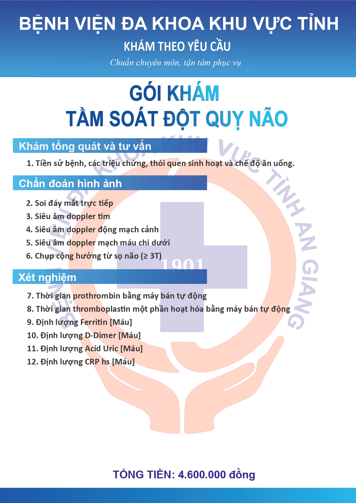 - Bạn hoàn toàn có thể thực hiện tầm soát đột quỵ não tại Bệnh viện Đa khoa Khu vực Châu Đốc thông qua gói khám chuyên biệt theo yêu cầu, được triển khai tại Khu Khám Theo Yêu Cầu của bệnh viện.