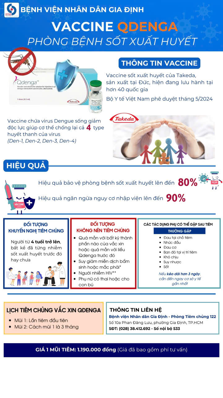 Bệnh viện Nhân dân Gia Định đang triển khai tiêm vắc xin Qdenga phòng sốt xuất huyết. Đây là loại vắc xin được sản xuất tại Đức, có thể bảo vệ cơ thể chống lại cả 4 type virus Dengue (DEN-1 đến DEN-4), với hiệu quả phòng bệnh lên đến 80%, và giảm nguy cơ nhập viện đến 90%.