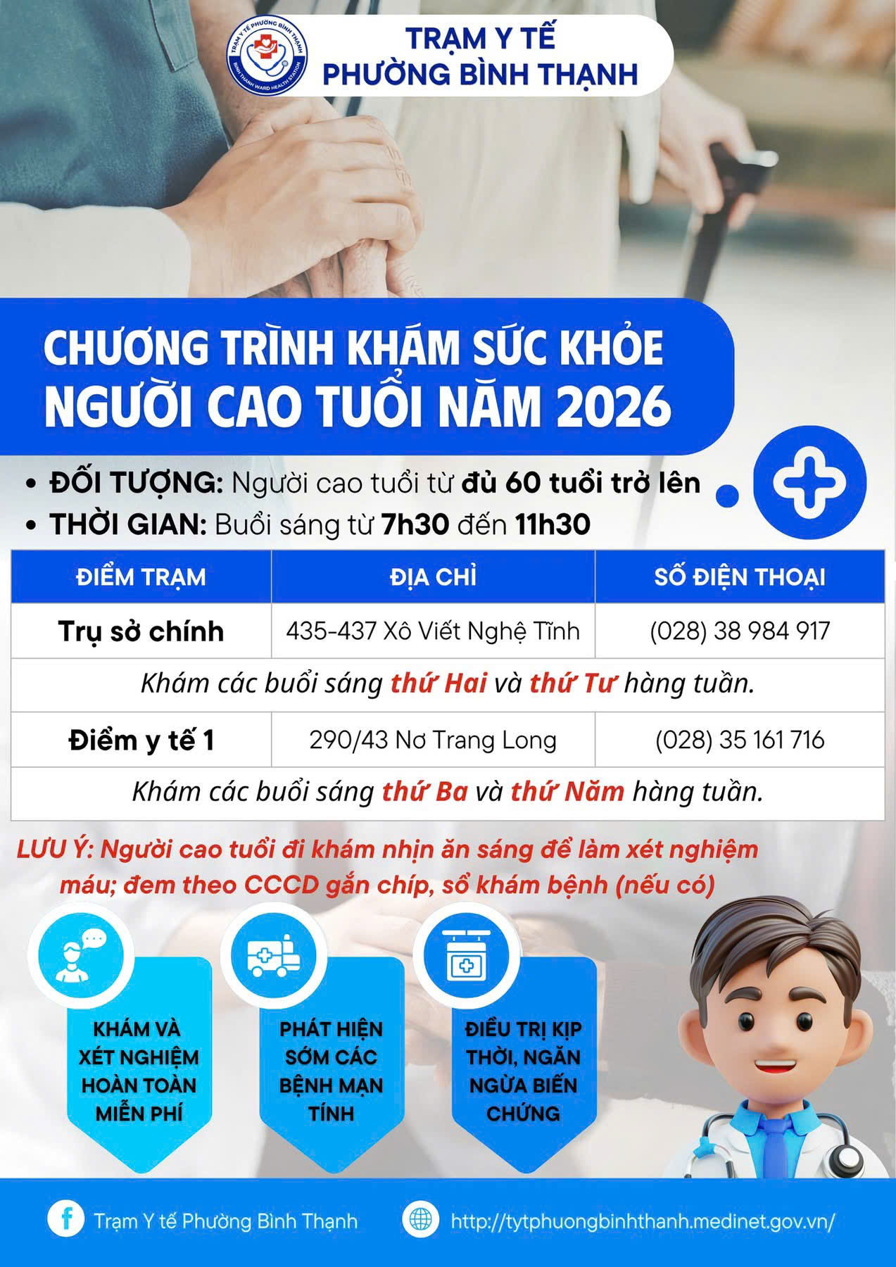 Hiện nay, Trạm Y tế Phường Bình Thạnh đang triển khai chương trình khám sức khỏe và xét nghiệm miễn phí năm 2026 dành cho người cao tuổi (từ đủ 60 tuổi trở lên) nhằm phát hiện sớm, điều trị kịp thời các bệnh mạn tính.