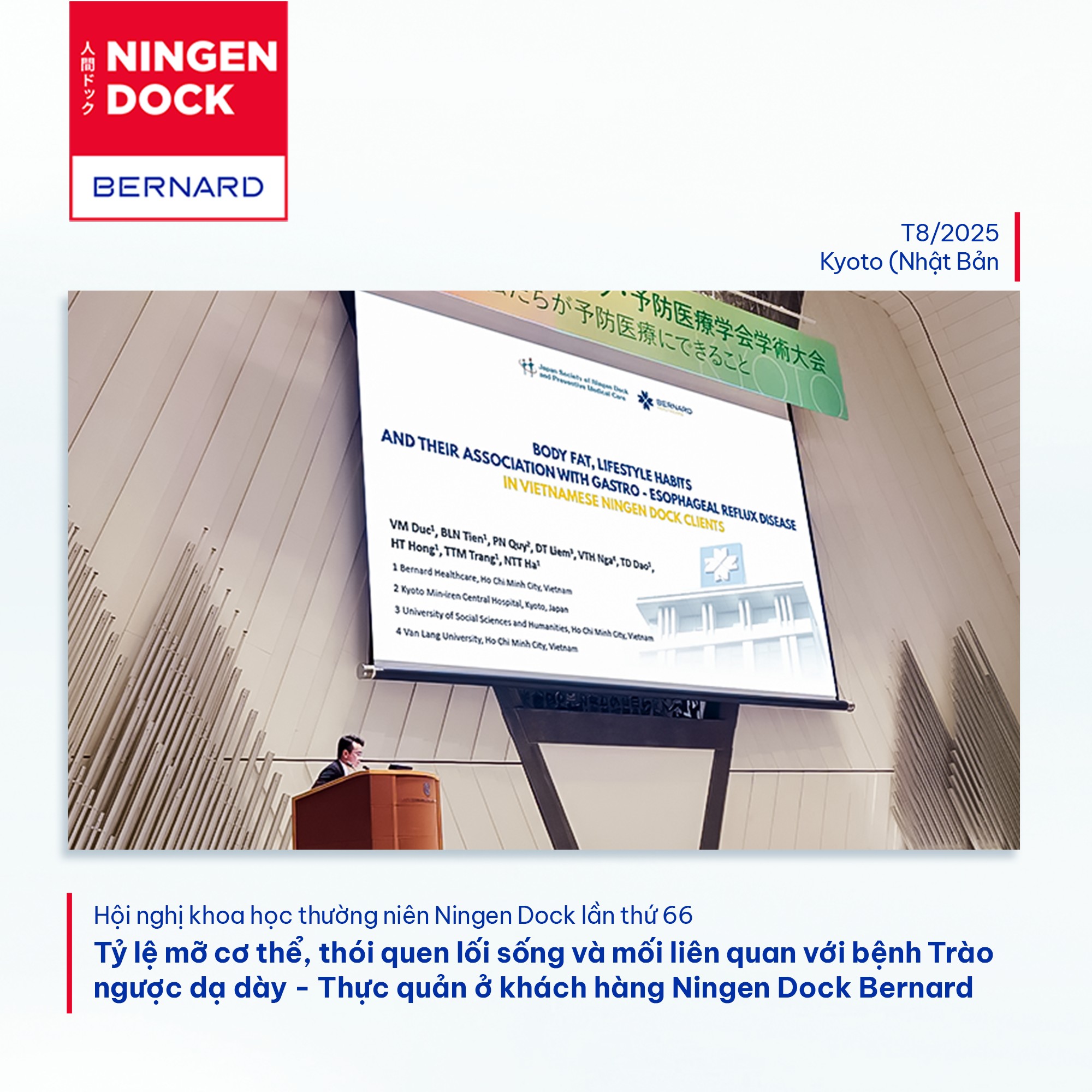 BS có thể chia sẻ cụ thể hơn về nghiên cứu mà Hệ thống Y khoa chuyên sâu Quốc tế Bernard trình bày tại Hội nghị Ningen Dock - mối liên hệ giữa tỷ lệ mỡ cơ thể (PBF) và bệnh trào ngược dạ dày - thực quản? Kết quả nghiên cứu này mang ý nghĩa như thế nào đối với việc tầm soát và dự phòng các bệnh lý chuyển hóa ở người Việt?