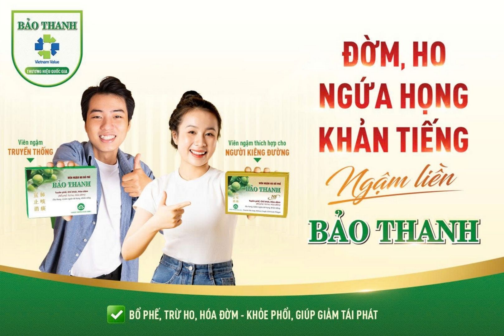 Với những ưu điểm nổi bật kể trên, Viên ngậm ho bổ phế Bảo Thanh là giải pháp an toàn và hiệu quả, giúp bạn nhanh chóng xua tan đờm, ho, ngứa họng, khản tiếng, góp phần bảo vệ hệ hô hấp khỏe mạnh, để bạn tận hưởng trọn vẹn từng khoảnh khắc cuộc sống.