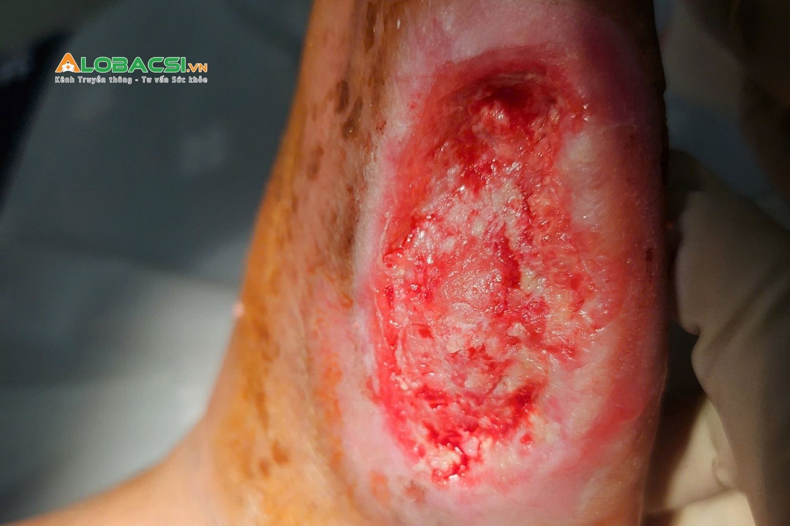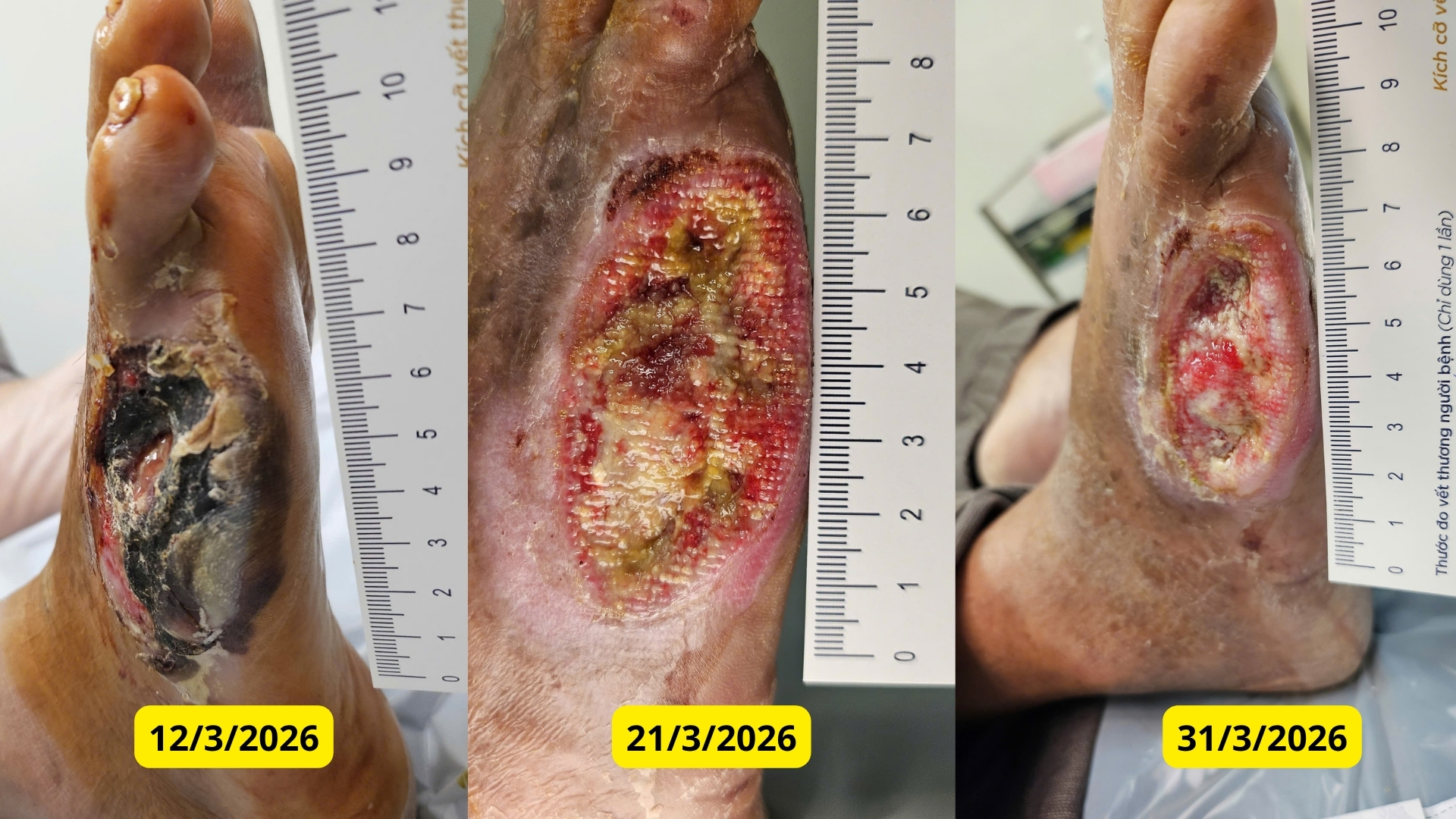 Từ ngày 12/3, bệnh nhân được điều trị chuyên sâu tại Đơn vị Điều trị vết thương chuyên sâu với các biện pháp cắt lọc mô hoại tử nhiều lần (khoảng 5 lần), đặt giá đỡ (scaffold) tại nền vết thương và dụng thuốc kháng khuẩn tại chỗ.