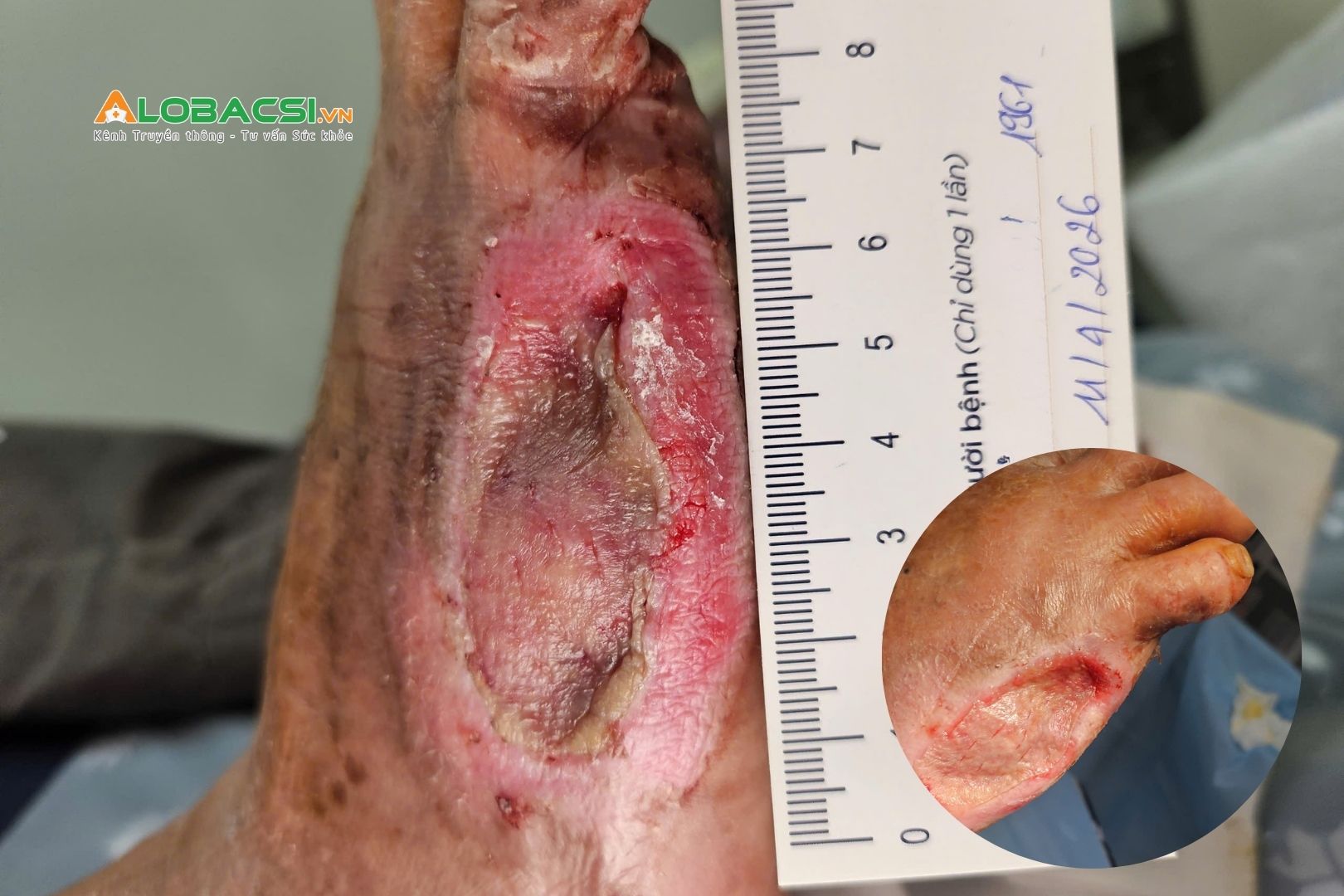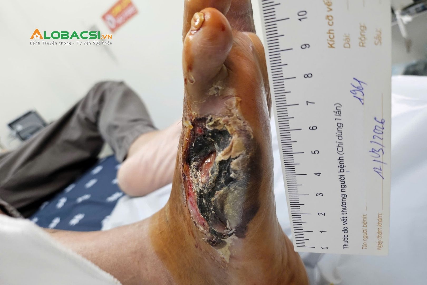 Bệnh nhân N.H.C (65 tuổi) từng phải phẫu thuật tháo bỏ ngón V bàn chân phải tại cơ sở y tế địa phương vào tháng 01/2026. Tuy nhiên, sau mổ, vết thương không lành mà ngày càng lan rộng, xuất hiện nhiều dịch mủ và tổ chức hoại tử, điều trị tại nhà không hiệu quả.