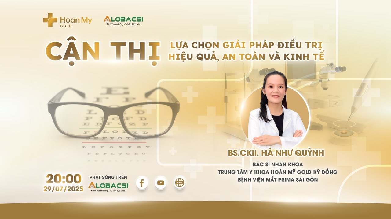 20 giờ, thứ Ba, 29/07/2025, BS.CKII Hà Như Quỳnh - Bác sĩ Nhãn khoa, Trung tâm Y khoa Hoàn Mỹ Gold Kỳ Đồng - Bệnh viện Mắt Prima Sài Gòn sẽ giải đáp cách lựa chọn phương pháp điều trị cận thị hiệu quả, an toàn và tiết kiệm chi phí. Đừng bỏ lỡ livestream hữu ích giúp bạn và gia đình chủ động hơn trong việc chăm sóc đôi mắt mỗi ngày.