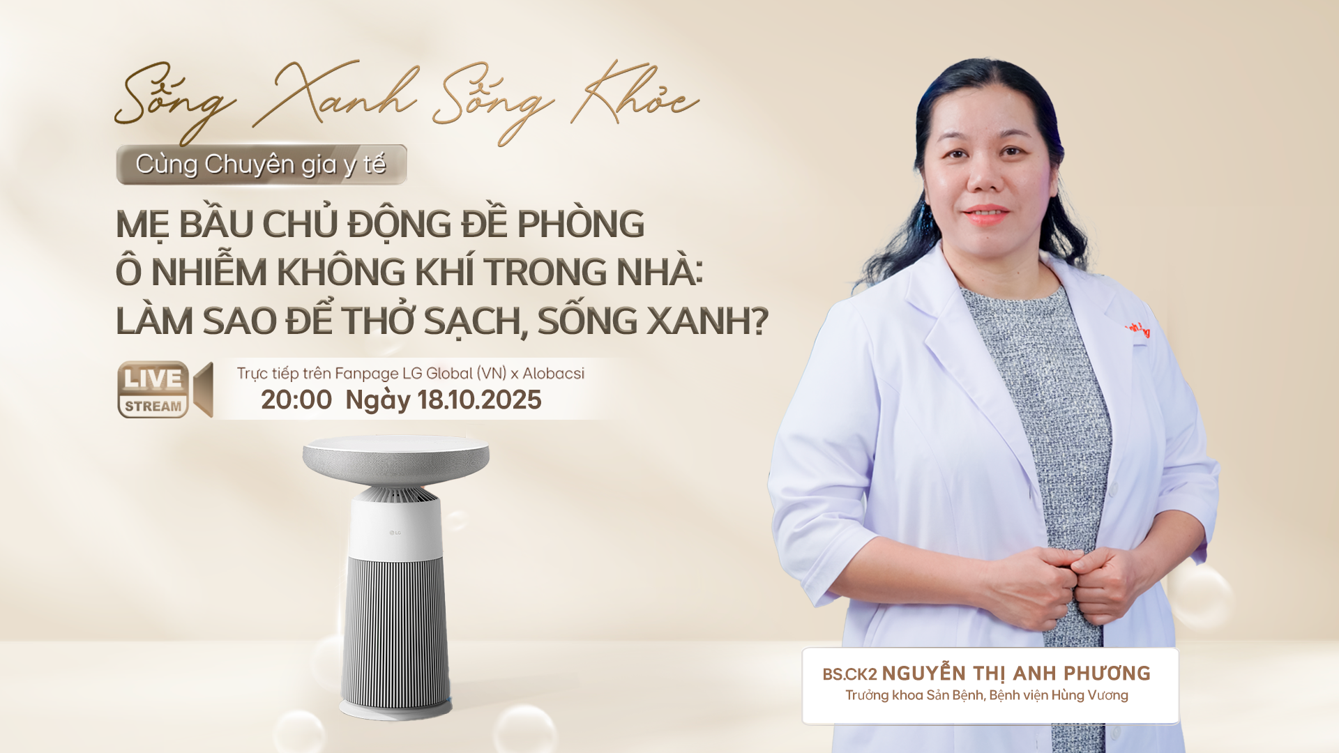 Trong số phát sóng kỳ 18 của chuỗi “Sống xanh - Sống khỏe”, AloBacsi phối hợp cùng Tập đoàn LG Việt Nam sẽ mang đến chủ đề thiết thực và dễ áp dụng: “Mẹ bầu chủ động đề phòng ô nhiễm không khí trong nhà - Làm sao để thở sạch, sống xanh?”, với sự tham gia tư vấn từ BS.CK2 Nguyễn Thị Anh Phương - Trưởng khoa Sản bệnh, Bệnh viện Hùng Vương (TPHCM).