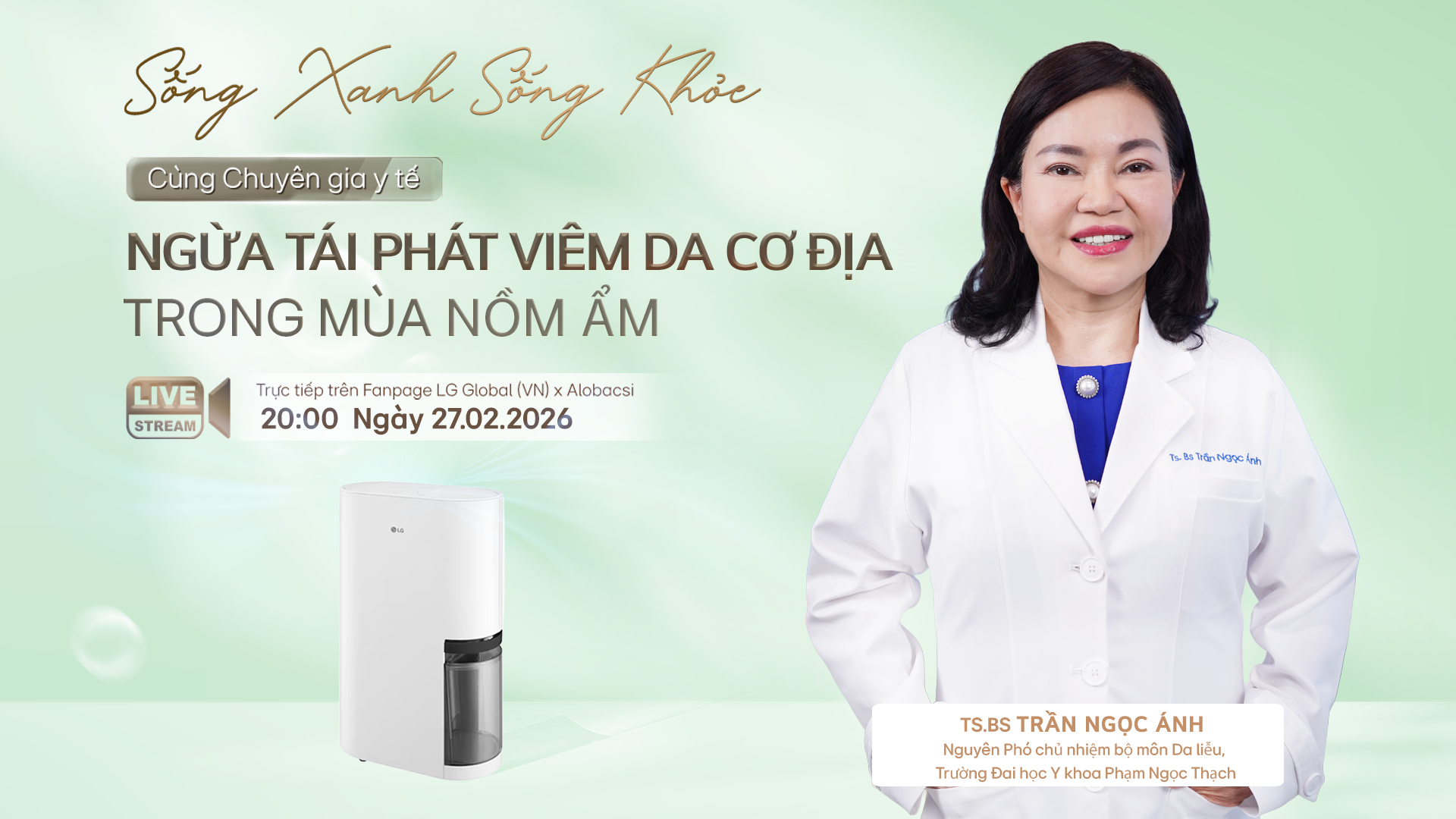 Trong số phát sóng mới nhất của chuỗi “Sống xanh - Sống khỏe”, AloBacsi phối hợp cùng LG Việt Nam mang đến chủ đề: “Ngừa tái phát viêm da cơ địa trong mùa nồm ẩm”, với sự tham gia tư vấn của TS.BS Trần Ngọc Ánh, phát sóng lúc 20h, ngày 27/2/2026 trên hệ thống đa kênh của AloBacsi và LG.