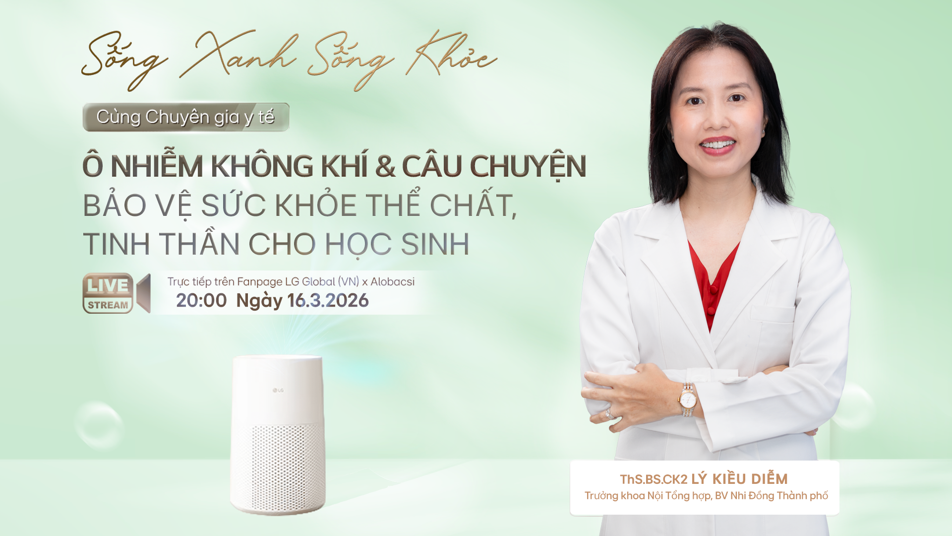 Tiếp nối chuỗi chương trình “Sống xanh - Sống khỏe”, AloBacsi phối hợp cùng LG Việt Nam mang đến chủ đề “Ô nhiễm không khí và câu chuyện bảo vệ sức khỏe thể chất, tinh thần cho học sinh”, với sự tham gia tư vấn của ThS.BS.CK2 Lý Kiều Diễm. Chương trình lên sóng lúc 20h ngày 16/3/2026 trên hệ thống đa kênh của AloBacsi và LG.