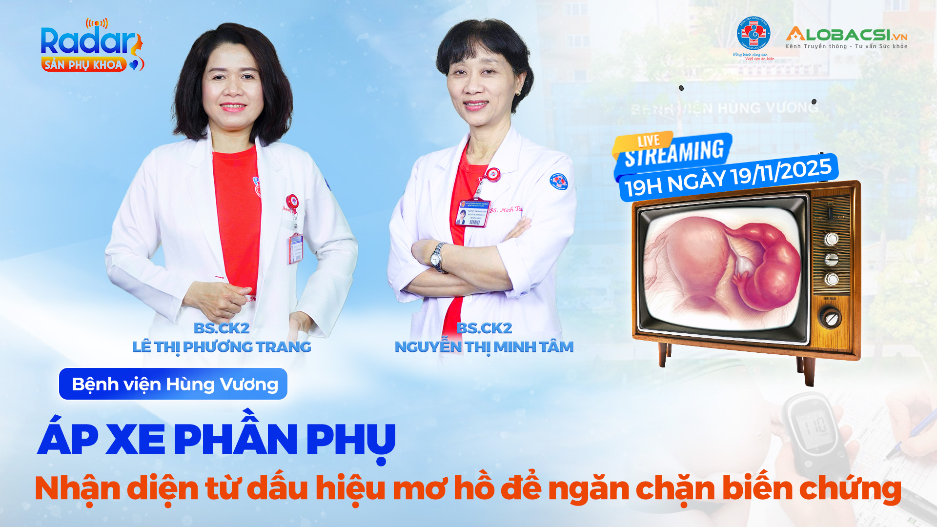 Áp xe phần phụ - bệnh lý phụ khoa dễ bị bỏ sót do triệu chứng mơ hồ nhưng có thể gây biến chứng nặng nề nếu chậm trễ điều trị. Những thắc mắc xoay quanh nguyên nhân, dấu hiệu cảnh báo và hướng xử trí an toàn sẽ được BS.CK2 Nguyễn Thị Minh Tâm và BS.CK2 Lê Thị Phương Trang - Bệnh viện Hùng Vương giải đáp trong chương trình Radar Sản Phụ khoa kỳ 43, phát sóng lúc 19h ngày 19/11/2025 trên hệ thống đa kênh của AloBacsi và Bệnh viện Hùng Vương.