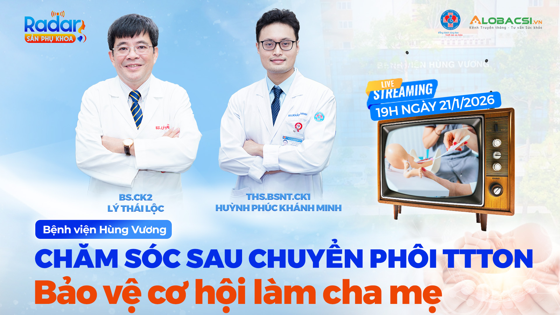 Từ nhu cầu đó, Radar Sản Phụ khoa kỳ 47 lên sóng với chủ đề “Chăm sóc sau chuyển phôi TTTON: Bảo vệ cơ hội làm cha mẹ”, mang đến những chia sẻ chuyên môn rõ ràng, dễ hiểu, giúp các cặp đôi vững tâm hơn trong giai đoạn quan trọng này. Chương trình được phát sóng lúc 19h, Thứ Tư, ngày 21/1/2026 trên fanpage Bệnh viện Hùng Vương và hệ thống đa kênh của AloBacsi (YouTube/ website/ fanpage).