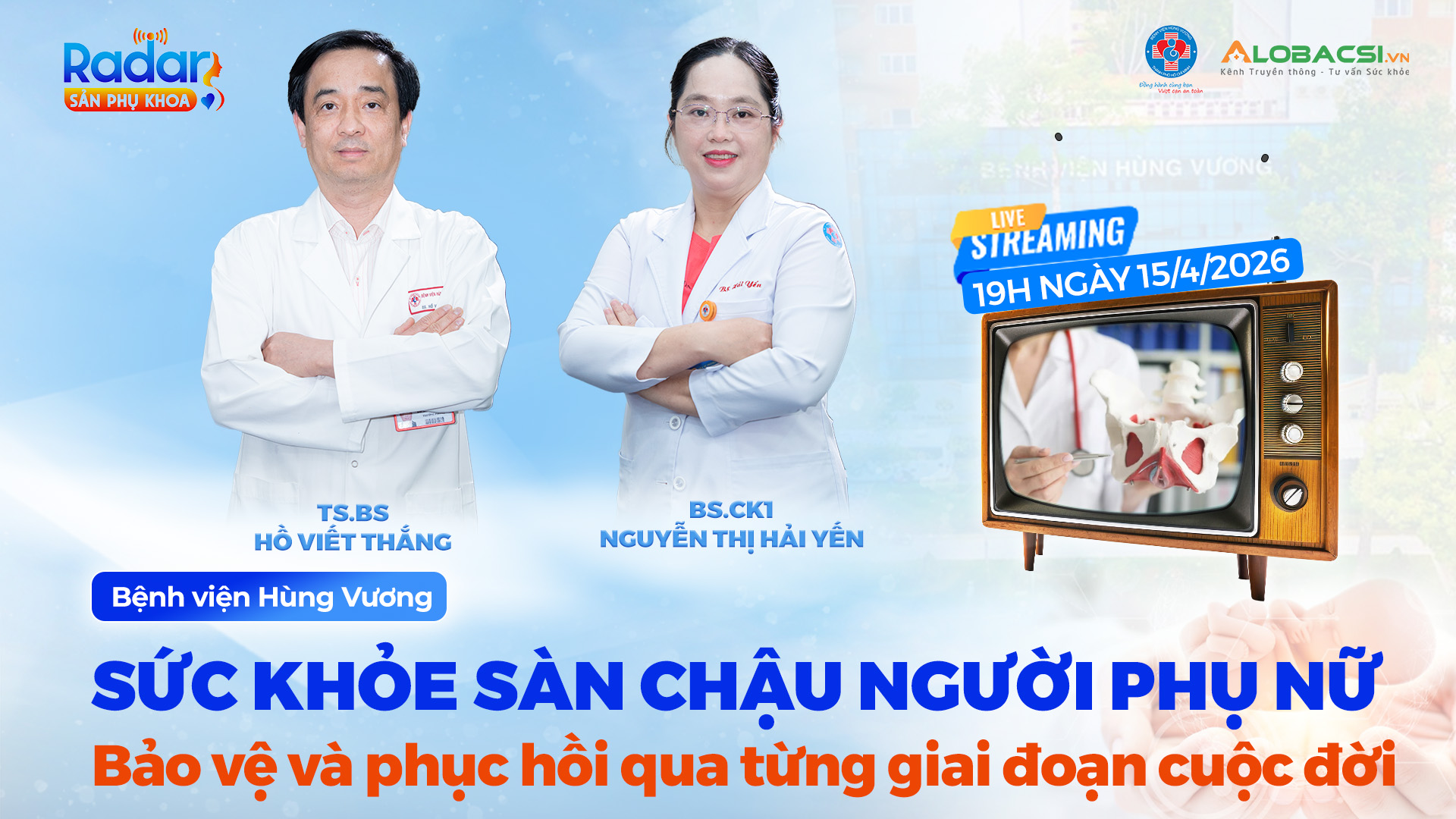Vậy làm sao để nhận biết sớm các vấn đề sàn chậu? Khi nào cần can thiệp? Có thể phục hồi bằng cách nào để cải thiện chất lượng sống? Những nội dung này sẽ được các chuyên gia phân tích rõ ràng, dễ hiểu trong Radar Sản Phụ khoa kỳ 53 với chủ đề “Sức khỏe sàn chậu người phụ nữ: Bảo vệ và phục hồi qua từng giai đoạn cuộc đời”. Chương trình được phát sóng lúc 19h, ngày 15/4/2026 trên youtube/ website Bệnh viện Hùng Vương và hệ thống đa kênh của AloBacsi (youTube/ website/ fanpage).