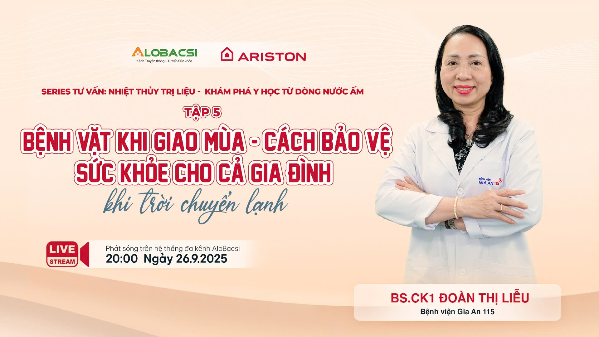 Chương trình sẽ phát sóng lúc 20h, thứ Sáu, ngày 26/9/2025 trên YouTube AloBacsi và Fanpage AloBacsi. Đừng bỏ lỡ những bí quyết khoa học, đơn giản mà hiệu quả để cả gia đình luôn an yên trong những ngày “trái gió trở trời”!