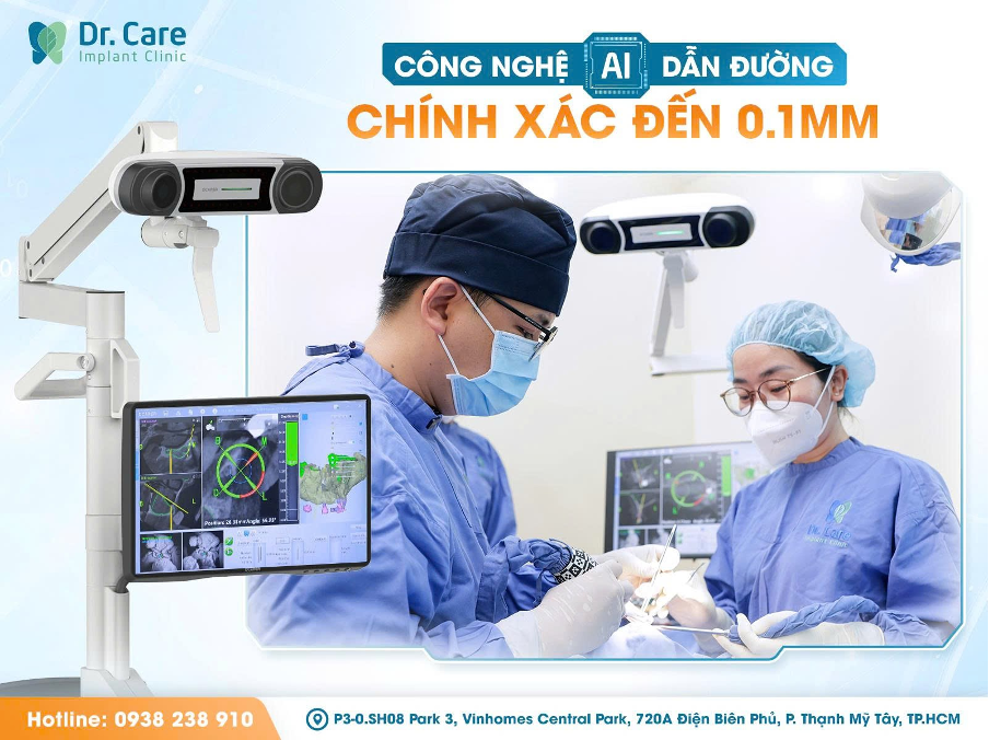Dr. Care đầu tư vào hệ thống trang thiết bị hiện đại, trong đó nổi bật là công nghệ DCarer Navigation - hệ thống dẫn đường Implant bằng trí tuệ nhân tạo. Theo nghiên cứu của Viện Implant Quốc tế (ITI) năm 2023, việc sử dụng công nghệ dẫn đường giúp tăng độ chính xác lên 95% so với phương pháp tự do, và giảm 60% thời gian phẫu thuật.