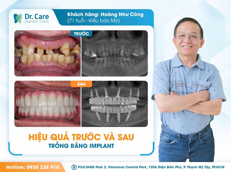 Dr. Care - Implant Clinic tự hào là đơn vị tiên phong mang đến giải pháp phục hình răng toàn hàm hiện đại, an toàn và hiệu quả, giúp hàng ngàn người trung niên Việt Nam lấy lại nụ cười rạng rỡ và chất lượng cuộc sống.