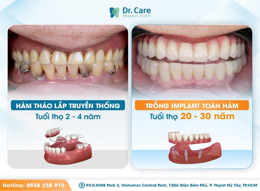 Dr. Care cam kết công khai, minh bạch chi phí, không phát sinh. Chi phí All-on-4 từ 109-149 triệu đồng, All-on-5 từ 134-184 triệu đồng, All-on-6 từ 158-218 triệu đồng, bảo hành 20-30 năm tùy dòng Implant.