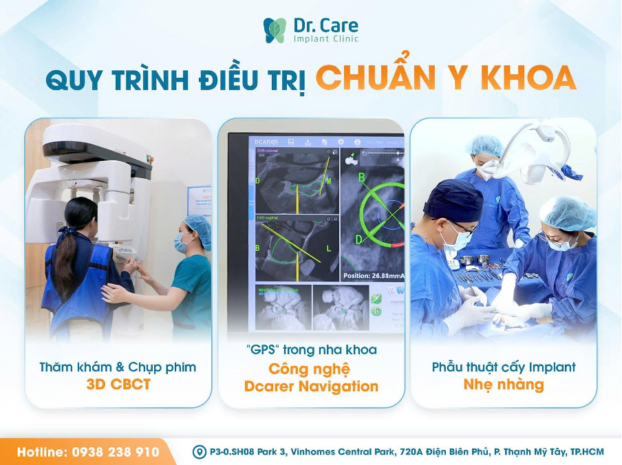 Dr. Care áp dụng quy trình 6 bước khoa học kết hợp công nghệ hiện đại. Bắt đầu với thăm khám và chụp phim 3D CBCT Conebeam đánh giá chi tiết xương hàm, xoang, thần kinh. Công nghệ DCarer Navigation - hệ thống dẫn đường AI giúp lập kế hoạch cấy Implant với độ chính xác tuyệt đối, tránh tổn thương thần kinh hay xoang.
