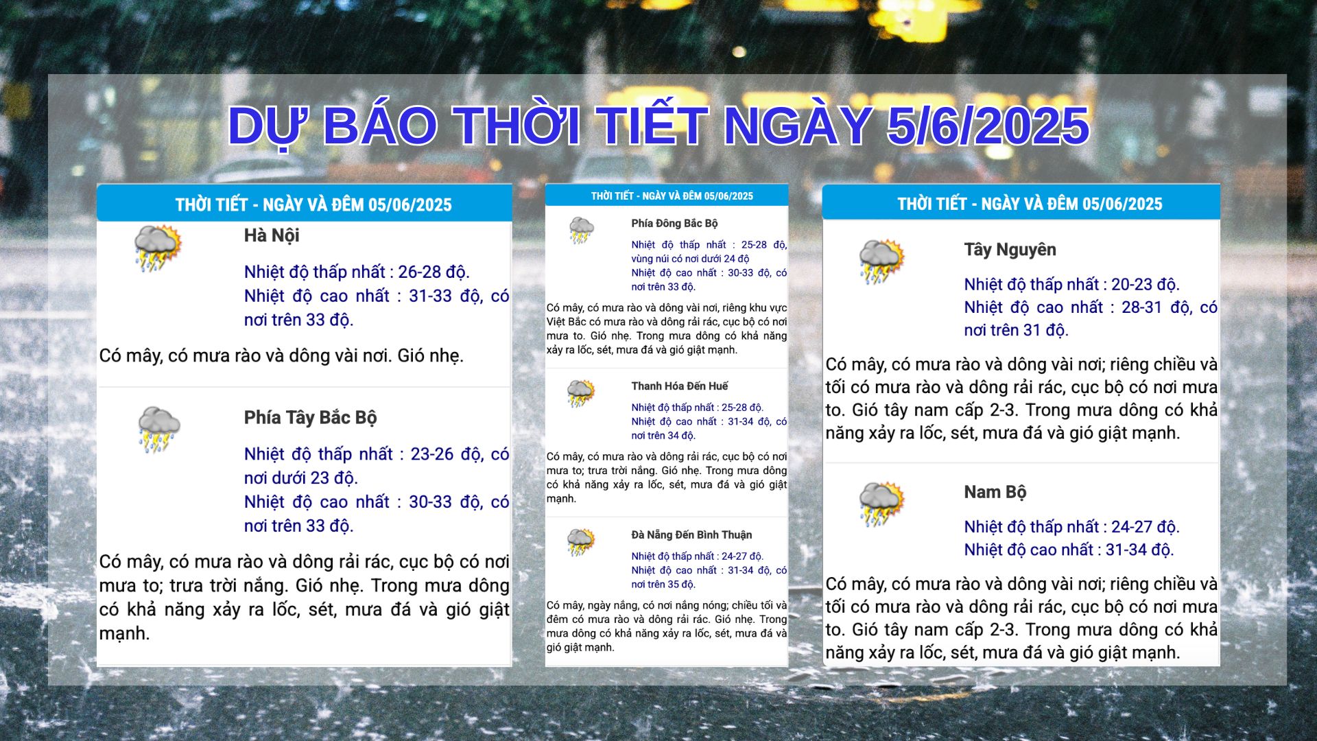 Từ Hà Nội đến Tây Nguyên, Nam Bộ, nhiều khu vực trên cả nước hôm nay, ngày 5/6/2025, có mưa rào và dông, cục bộ mưa to trên 70mm. Trung tâm Dự báo Khí tượng Thủy văn Quốc gia cảnh báo nguy cơ cao xảy ra lốc, sét, mưa đá, gió giật mạnh, lũ quét và sạt lở đất tại các vùng núi, ngập úng vùng trũng thấp. Người dân cần chú ý theo dõi bản tin dự báo thời tiết và hạn chế di chuyển qua khu vực nguy hiểm.