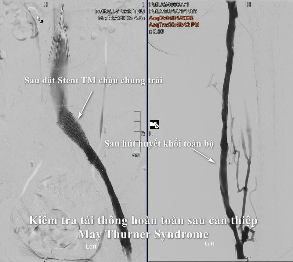 Tại S.I.S Cần Thơ, qua siêu âm Doppler và chụp CT, bác sĩ xác định nguyên nhân không chỉ là huyết khối đơn thuần mà còn liên quan hội chứng May-Thurner - tình trạng chèn ép tĩnh mạch chậu trái, cản trở dòng máu hồi lưu và gây hình thành huyết khối.