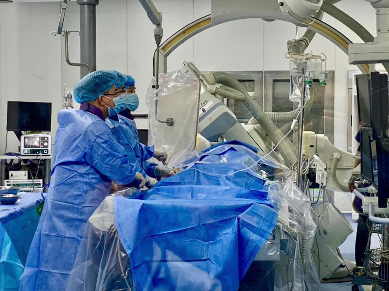 Dưới sự chỉ đạo trực tiếp của GS.TS Phạm Mạnh Hùng - Viện trưởng Viện Tim mạch, Bệnh viện 19-8, ê-kíp đã tiến hành can thiệp mạch vành qua da (PCI), nong bóng và đặt stent phủ thuốc, tái thông hoàn toàn dòng chảy mạch vành trong “giờ vàng”, giúp bệnh nhân qua cơn nguy kịch.