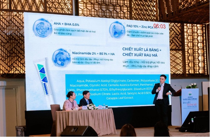 Trong dòng chảy chuyên môn sôi động của hội nghị, Dược mỹ phẩm Trioderma đã tạo dấu ấn rõ nét với hình ảnh một thương hiệu Việt theo định hướng y khoa, được nghiên cứu và phát triển dựa trên nền tảng lâm sàng cùng sự đồng hành của đội ngũ chuyên môn từ Bệnh viện Da Liễu TP.HCM. Đáng chú ý, giải pháp chăm sóc da mụn của Trioderma đã được đề cập trong bài báo cáo khoa học của ThS.BSNT Nguyễn Duy Quân với chủ đề “Chiến lược phối hợp đa cơ chế trong điều trị mụn trứng cá – vai trò của dược mỹ phẩm trong thực hành lâm sàng”. Sự hiện diện trong nội dung báo cáo khoa học là minh chứng cho tính ứng dụng và giá trị chuyên môn của sản phẩm trong thực tiễn điều trị.