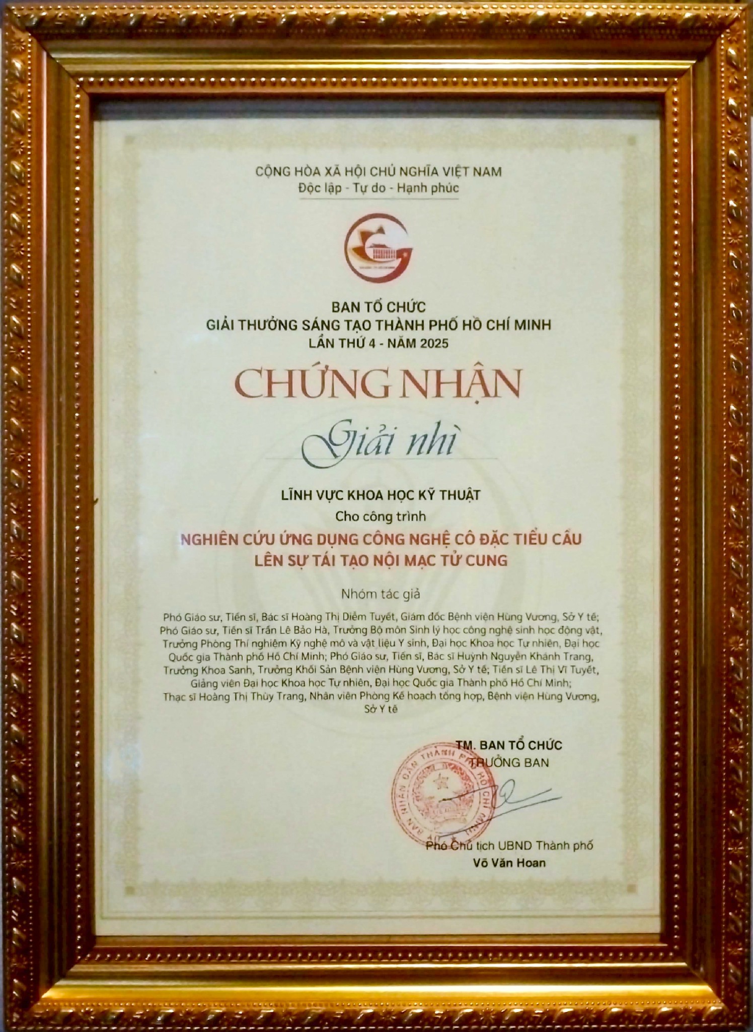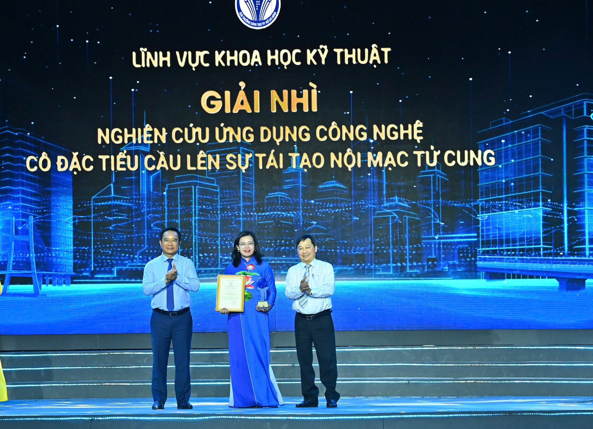 Giữa không khí trang trọng của Lễ trao Giải thưởng Sáng tạo TPHCM lần thứ 4, diễn ra vào tối 1/7/2025 tại phố đi bộ Nguyễn Huệ - nơi trái tim của thành phố rực rỡ ánh đèn và chan chứa tinh thần đổi mới - Bệnh viện Hùng Vương đã được xướng tên ở Giải Nhì lĩnh vực Khoa học kỹ thuật, với một công trình mang đậm dấu ấn nhân văn: “Nghiên cứu ứng dụng công nghệ cô đặc tiểu cầu PRF lysate trong tái tạo nội mạc tử cung”.